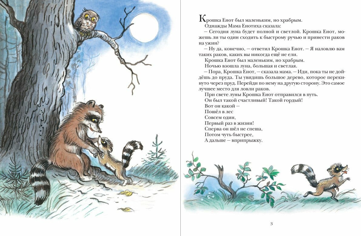 Эта книжка американской поэтессы Lilian Moore (1909–2004) открывается цикл из 7 книг о крошке Еноте. Остальные части на русский язык не переводились. В США популярностью не пользуется и не переиздаётся. Данное произведение было опубликовано в советском журнале "Неделя" в сокращённом пересказе Образцовой в 1964 году. С тех пор издаётся только с этим текстом. И благодаря замечательному мультфильму и иллюстрациям Назарука и Сутеева Крошка Енот уже давно наш родной и любимый уже не первое поколение.