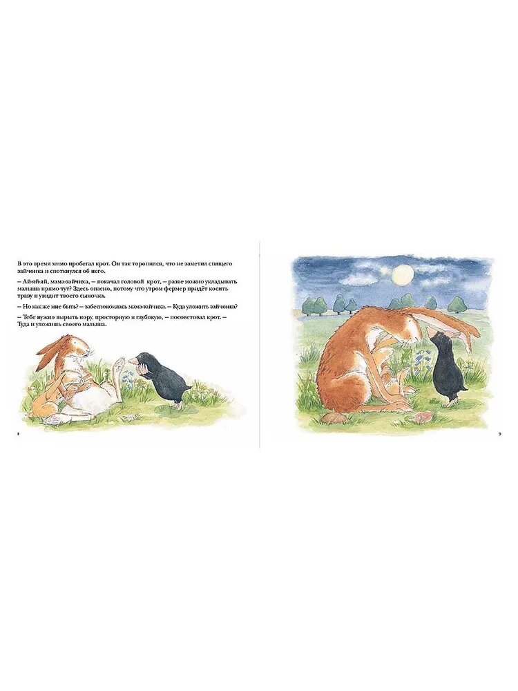 Вечером заботливая мама-зайчиха уложила своего зайчонка на травку и присела рядом, чтобы охранять его сон. И все бы хорошо, вот только пробегавший мимо крот строго сказал зайчихе, что укладывать малыша в чистом поле крайне небезопасно и посоветовал ей вырыть глубокую нору.