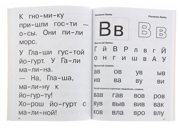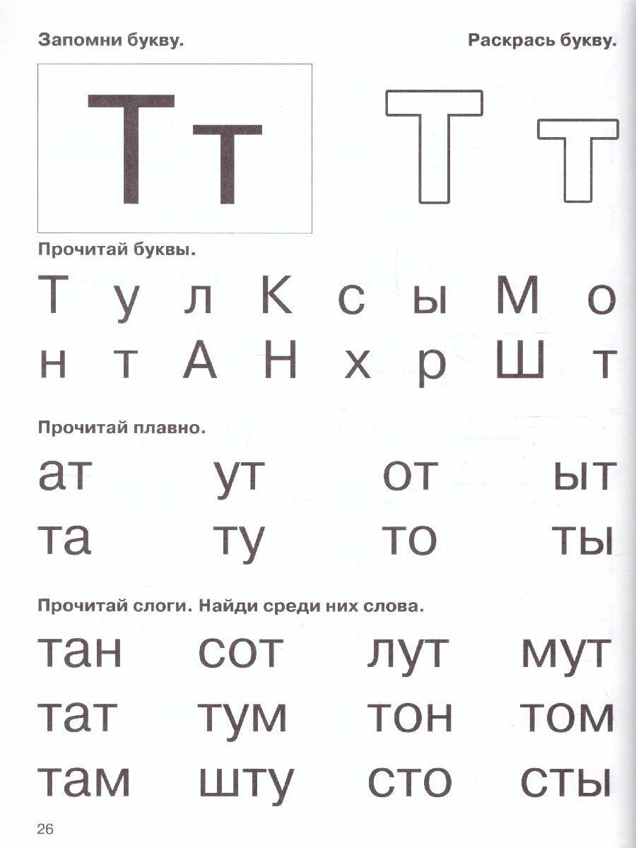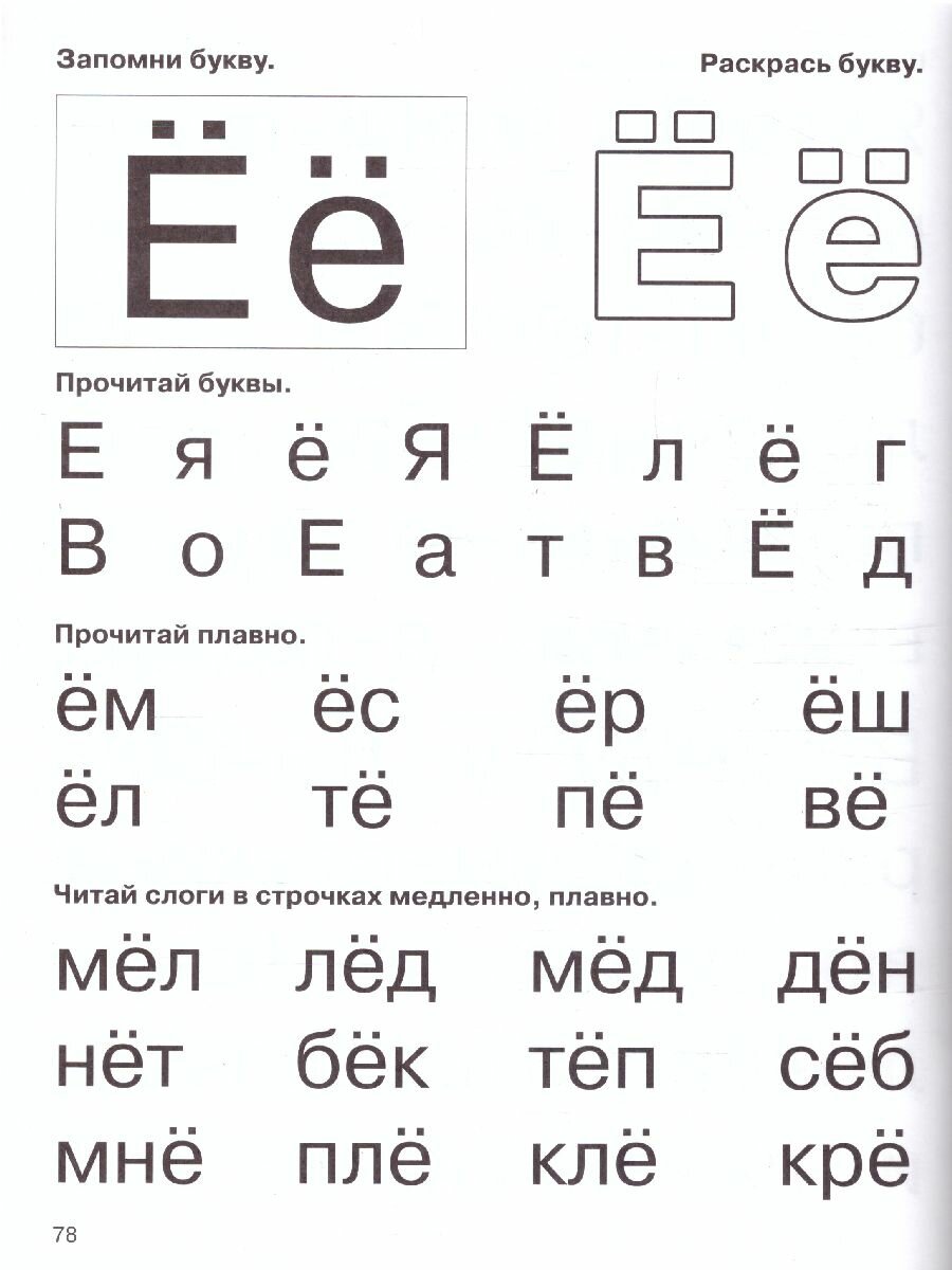 Одна из самых удачных книг по тренировке чтения по слогам (по моему мнению). Буквы крупные. Слоги правильные. Словарный, так сказать, ассортимент то же не вызывает нареканий (в отличие от других изданий, где например встречается слово,, гроб,,. и мне придеться в 5 лет отвлекаться от занятия и объяснять ребенку , что это и для чего.) Страницы черно-белые, но здесь, я думаю, цветность и не нужна.