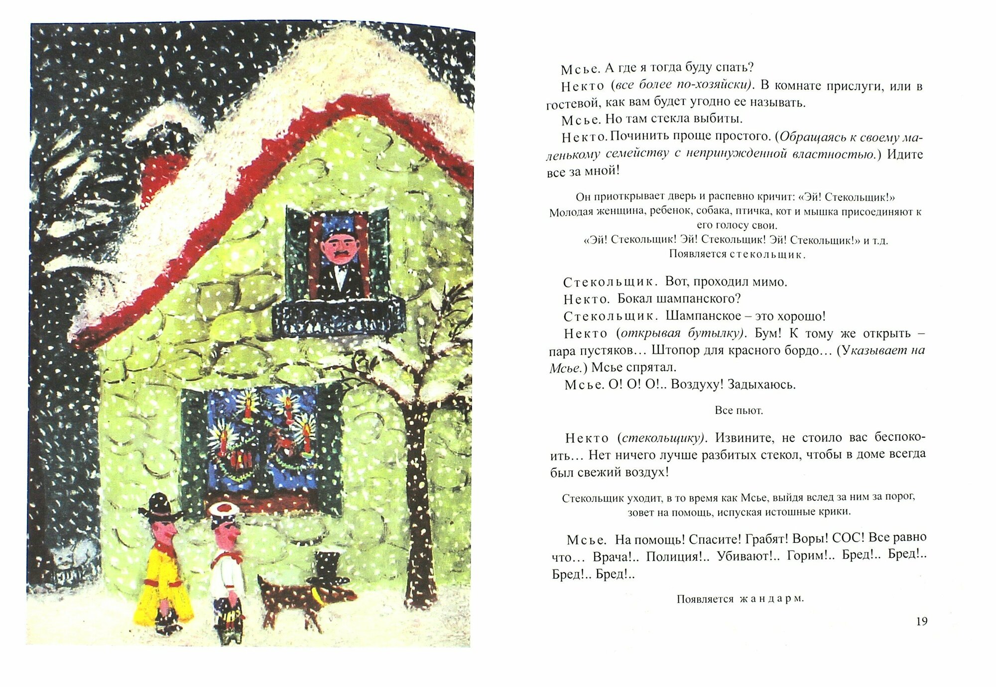 "Гиньоль" - книга, созданная Превером в соавторстве с художницей Эльзой Энрикес. Текст и иллюстрации образуют здесь единое целое, дополняют и обогащают друг друга. Степенный, добропорядочный мсье вдруг обнаруживает, что на Рождество в его доме обосновалось целое семейство незваных гостей, включая собаку, кошку, мышку и канарейку. И эти гости не просто не желают уходить, но распивают хозяйское шампанское, лакомятся праздничным ужином, курят дорогие сигары, без спроса заводят музыкальную шкатулку, танцуют, да и вообще ведут себя весьма бесцеремонно... Пьеса полна остроумия, тонкой иронии, блистательных игр со словом, характерных для всего творчества Превера. Адресуя книгу детям, автор тем не менее затрагивает проблемы, над которыми стоит призадуматься и взрослым читателям.