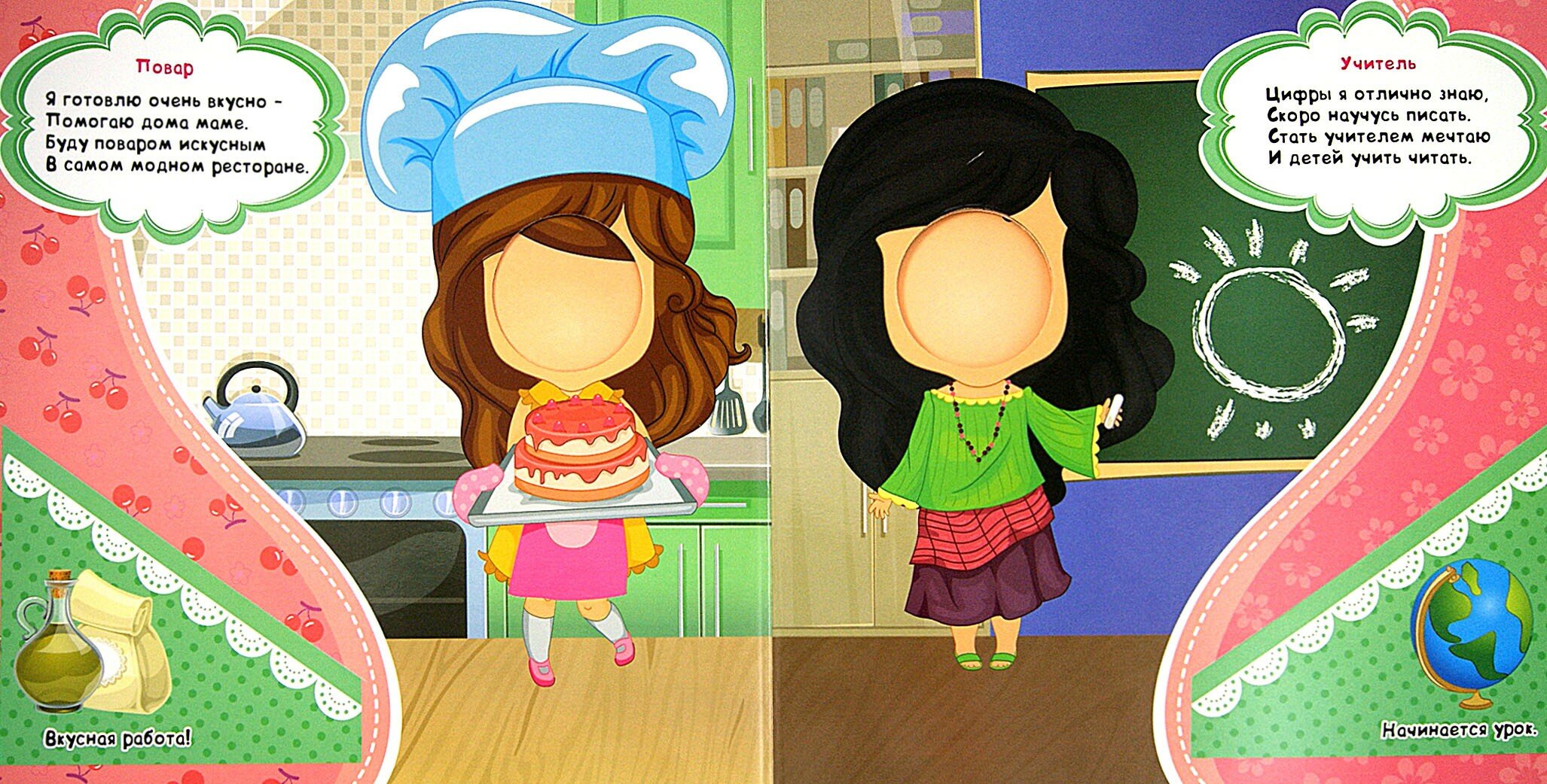 В эту книгу можно (рекомендовано) вставить фото лиц. Можно вставить фото вашей малышки, а можно еще и фото близких родственников, каждому раздав "её профессию".