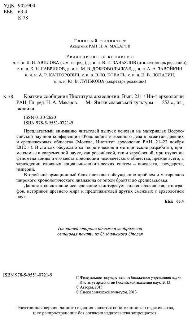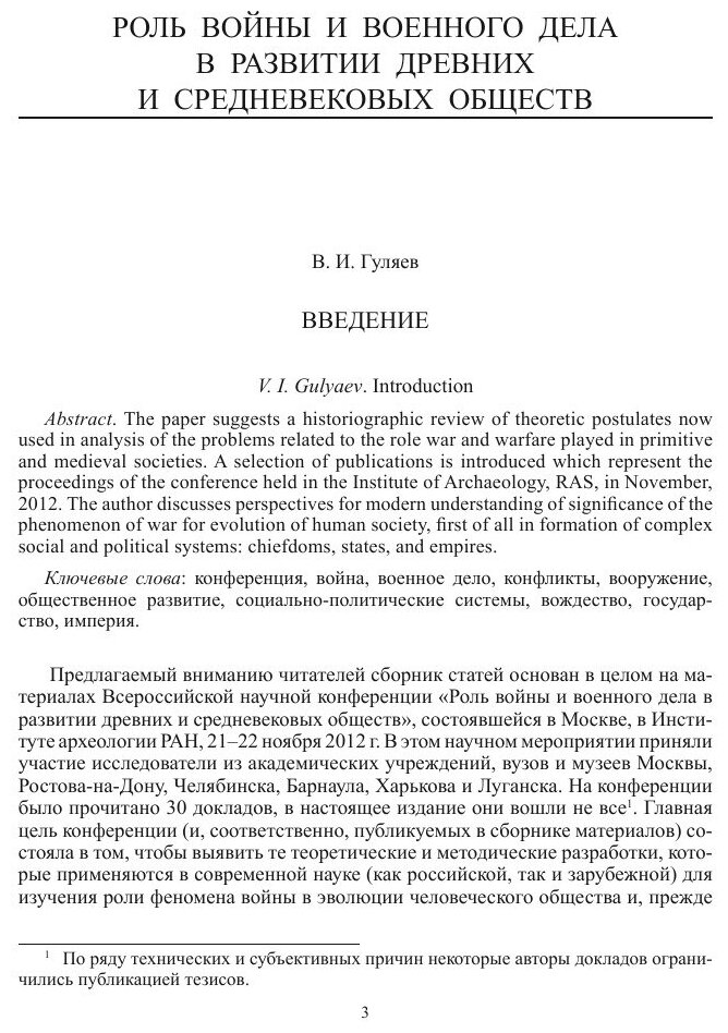 Предлагаемый вниманию читателей выпуск основан на материалах Всероссийской научной конференции "Роль войны и военного дела в развитии древних и средневековых обществ" (Москва, Институт археологии РАН, 21-22 ноября 2012 г.). В статьях обсуждаются теоретические и методические разработки, применяемые в современной науке, как российской, так и зарубежной, при изучении феномена войны и его места в эволюции человеческого общества, прежде всего, в зарождении сложных социально-политических систем - вождеств, государств, империй.