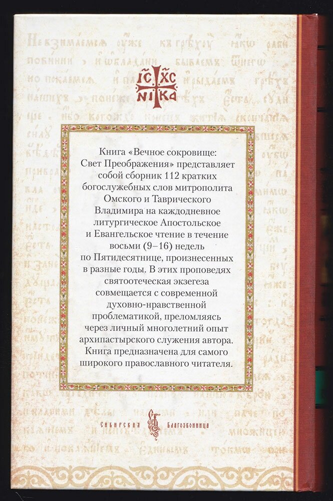 Книга "Вечное сокровище: Свет Преображения" представляет собой сборник 112 кратких богослужебных слов митрополита Омского и Таврического Владимира на каждодневное литургическое Апостольское и Евангельское чтение в течение восьми (9-16) недель по Пятидесятнице, произнесенных в разные годы. В этих проповедях святоотеческая экзегеза совмещается с современной духовно-нравственной проблематикой, преломляясь через личный многолетний опыт архипастырского служения автора. Книга предназначена для самого широкого православного читателя.