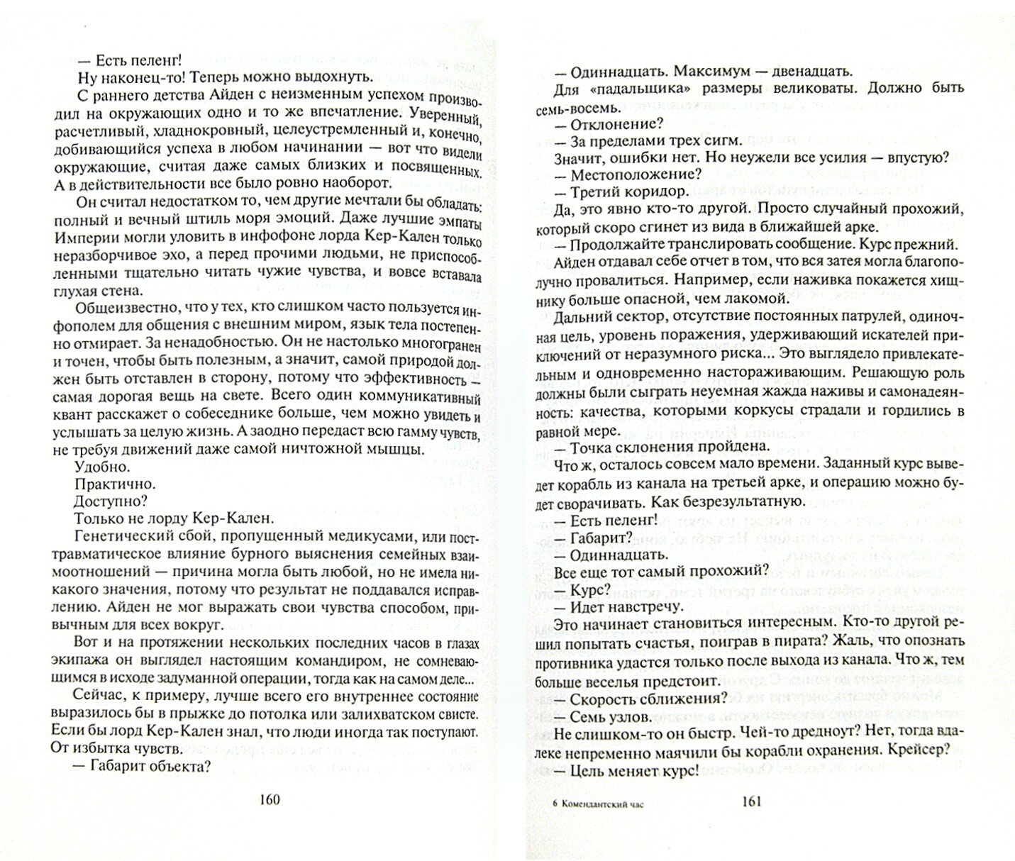 Книга сложная для восприятия. И если книги Вероники Ивановой из цикла "Отражения" ("Право быть", "Узкие улочки жизни" и т.д.), а также "(На)следственные мероприятия" и др., несмотря на некие философские размышления, зачастую рефлексии главного героя и т.д. оставили впечатление об авторе как талантливом и самобытном, создающим очень необычные миры, то книга "Комендантский час" произвела двойственное впечатление. Ответы на многие вопросы не получены. Суть сюжета такова. Главный герой - Стас - человек безусловно талантливый, но в силу неких причин не востребованный в нашем мире, похищается представителями другой цивилизации. Цивилизация стоит на несколько порядков выше, чем земная. Все люди там научились воздействовать на окружающий мир, расширив границы воздействия на этот мир и свои заложенные природой возможности. Стаса буквально бросают в иное измерение, практически ничего ему не объясняя. И он должен совершить там некий поступок (найти предателя, о чем он и сам не знает), не обладая и малой толикой способностей инопланетян, поскольку представители нового мира, оказывается, получив сверхспособности, стали неспособны к сопереживанию, сочувствию и т.д. Что, в конечном счете, ведет к вырождению цивилизации.