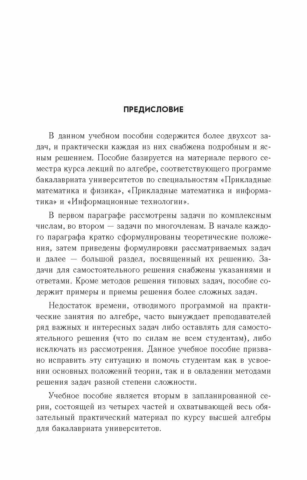 Книга содержит более двухсот задач по комплексным числам и многочленам, практически каждая из них снабжена подробным и ясным решением. В начале каждого параграфа приведены необходимые теоретические положения. Выбор задач соответствует курсу высшей алгебры для обучающихся по образовательным программам подготовки бакалавров университетов и технических вузов по направлениям "Прикладные математика и физика", "Прикладные математика и информатика" и "Фундаментальная информатика и информационные технологии".