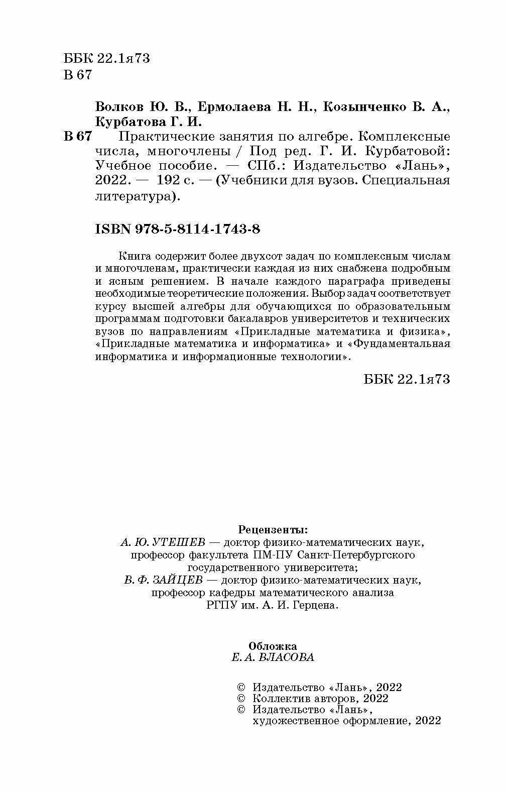 Практические занятия по алгебре. Комплексные числа многочлены. Учебное пособие (Волков Юрий Владимирович, Ермолаева Надежда Николаевна, Козынченко Владимир Александрович, Курбатова Галина Ибрагимовна); Лань, 2014
