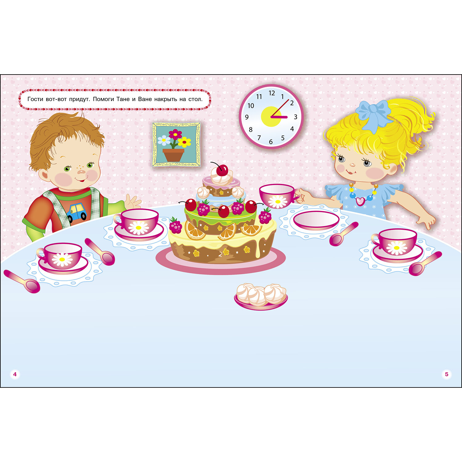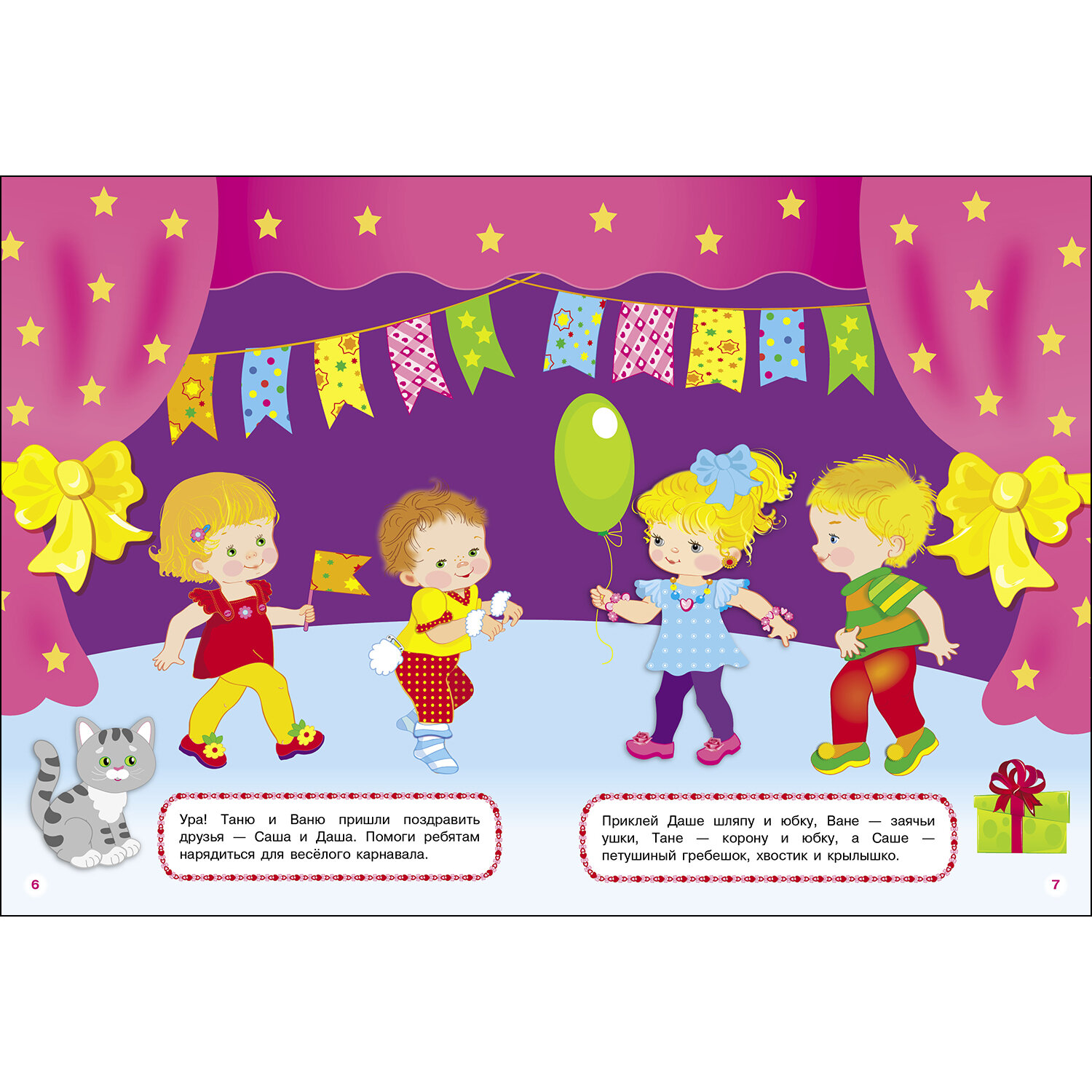 Сверху даны задания, простые и понятные для детей. (украсить комнату, накрыть на стол, украсить торт, дополнить наряды, наклеить подарки). -