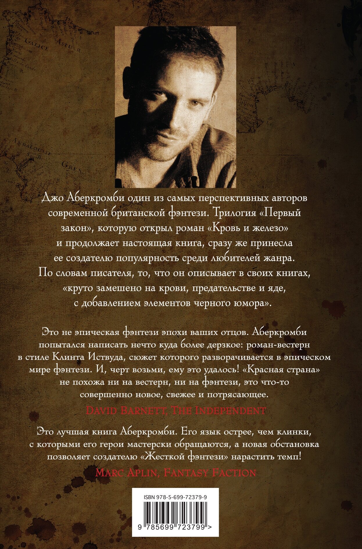 Последний перед длинным перерывом (2-3 года) самостоятельный роман из цикла «Земной круг». «Красная страна» обязательно порадует поклонников первой трилогии Аберкромби под названием «Первый Закон» (Кровь и железо, Прежде чем их повесят, Последний довод королей). В первую очередь появлением полюбившихся персонажей (Никомо Коска, Логен Девятипалый)! Во-вторых, точно в памяти читателя останутся отличные диалоги и качество, рельефность представленных в романе героев. В-третьих, этот роман практически классический вестерн в атмосфере темного фэнтези - такое не часто увидишь. К минусам можно отнести некоторые проблемы с сюжетом и интригой (затянутость начала, сумбурность финала произведения) и большое число псевдофилософских высказываний не к месту.