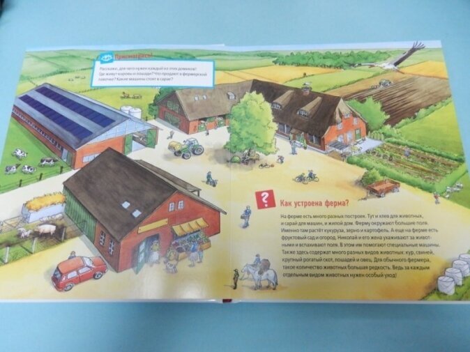 Лучшая книга про животных на ферме! При возможности, покупайте, не пожалеете. Качество отменное! Большой формат, в ширину больше А4, очень плотные картонные листы, сами створки более тонкие Изображения все реалистичные, никакой мультяшности, что однозначно плюс. Створок много, тем тоже. Не только просто про животных , но и про машины, которые работают в поле и на ферме. Есть подробные, со створками, изображения этих машин - у моего сына это хит. Интересно будет и малышам от года и деткам постарше (даже 5леткам), так что книга вполне универсальная. Кроме самих Створок и картинок, есть небольшие задания для деток постарше. Текста не очень много, он несложный, что отлично стимулирует к вопросам и развивает речь