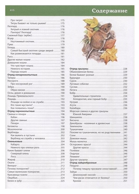 Я выбираю книги по многим параметрам, помимо содержания и качества написания, для меня важны хорошие иллюстрации, качество печати, тип бумаги (предпочитаю офсетную). Это книжка соответствует всем этим параметрам. Мне в ней нравится всё. Во-первых полнота содержания, в книге 415 страниц формата Ф4, которые содержат информацию о животных, подразделённых на отряды. Самое главное то, что авторы предугадывали вопросы "почемучек" и забежав вперёд, написали об этом в книге. Ещё в содержании имеются разделы о том, где описано как чувствуют животные, как общаются, какими умениями владеют. Так что почитать есть что. Ну и не менее главный фактор - это качество печати. Лично я в полном восторге, весь шрифт хорошо напечатан, причём он достаточно крупный, что удобно для детского чтения, а иллюстрации на пять баллов просто. Хоть и хвалят мелованную бумагу, как бумагу высокого качества, но я люблю вот такую, как в этой книге. Никаких бликов и глянца, что не допустимо при детском чтении. Посему резюмирую, что книгой очень довольна, всем советую!
