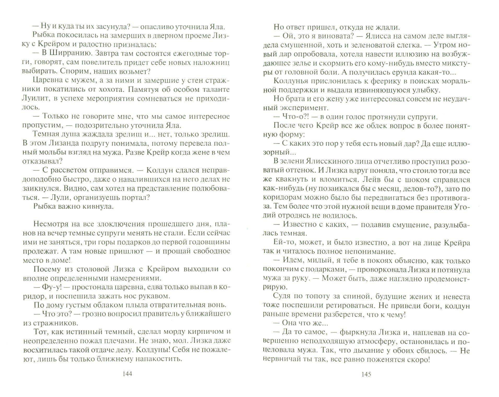 Темные, будь они неладны! И угораздило же связаться с одним из них! Вот уж чего Лизка от себя не ожидала. Впрочем, становиться царевной и перебираться в параллельный мир она тоже не планировала. Но ничего не поделаешь, приходится обживаться в мрачных Угодьях и повелевать злобными духами. А впереди свадьба с колдуном, обретение темного дара, новые друзья и враги. Козни злодеев опасны, но три желания от золотой рыбки с чем угодно помогут справиться. Главное — слушать свое сердце и не верить глазам.