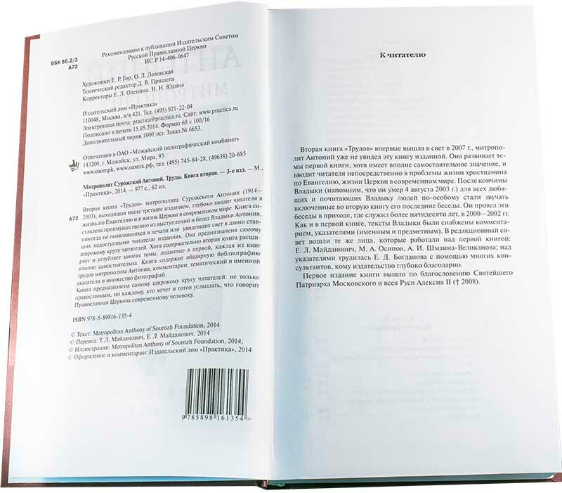 Вторая книга "Трудов" митрополита Сурожского Антония (1914- 2003), выходящая ныне третьим изданием, глубоко вводит читателя в жизнь по Евангелию и в жизнь Церкви в современном мире. Книга составлена преимущественно из выступлений и бесед Владыки Антония, никогда не появлявшихся в печати или увидевших свет в давно ставших недоступными читателю изданиях. Она предназначена самому широкому кругу читателей. Хотя содержательно вторая книга расширяет и углубляет многие темы, поднятые в первой, каждая из книг вполне самостоятельна. Книга содержит обширную библиографию трудов митрополита Антония, комментарии, тематический и именной указатели и множество фотографий.