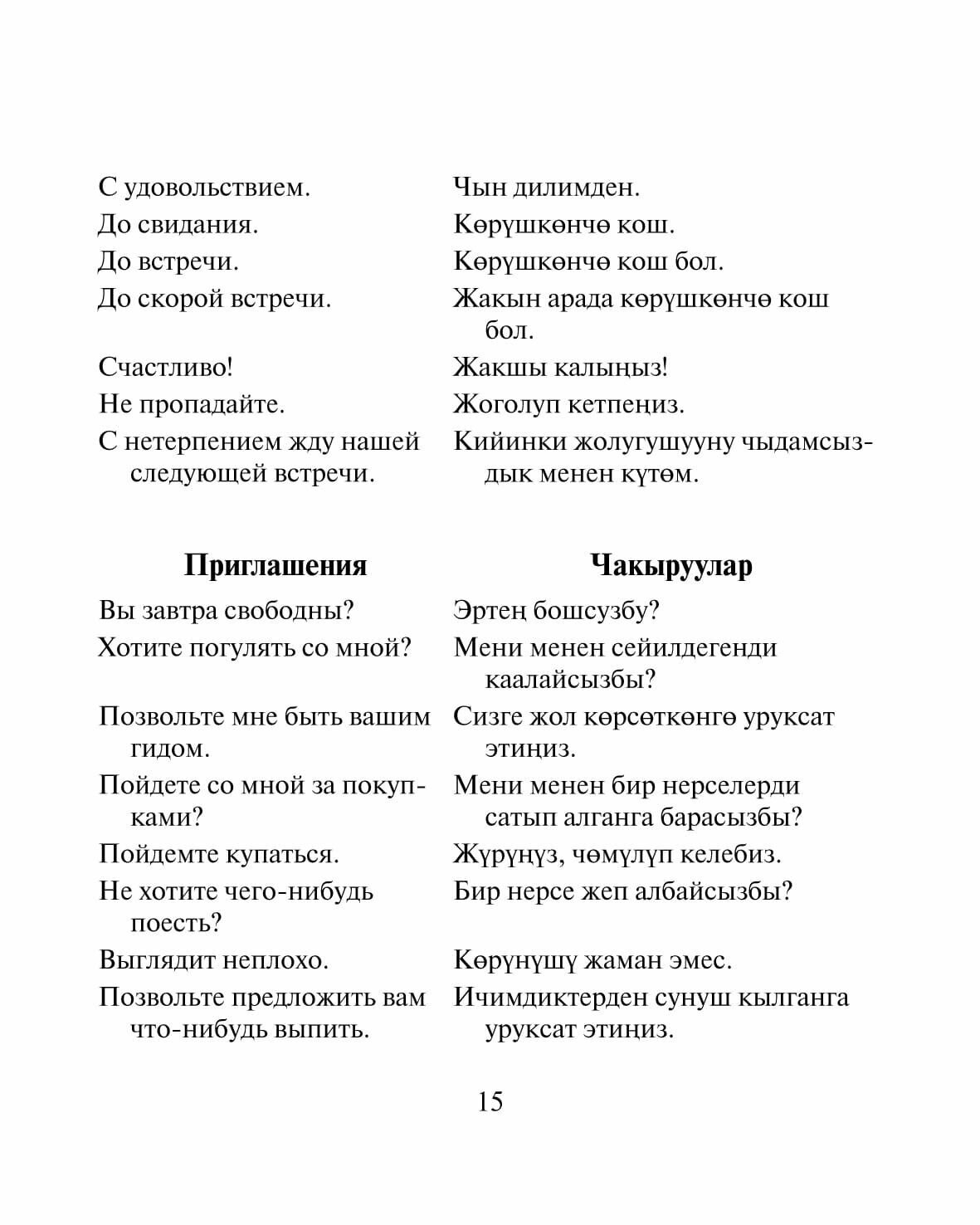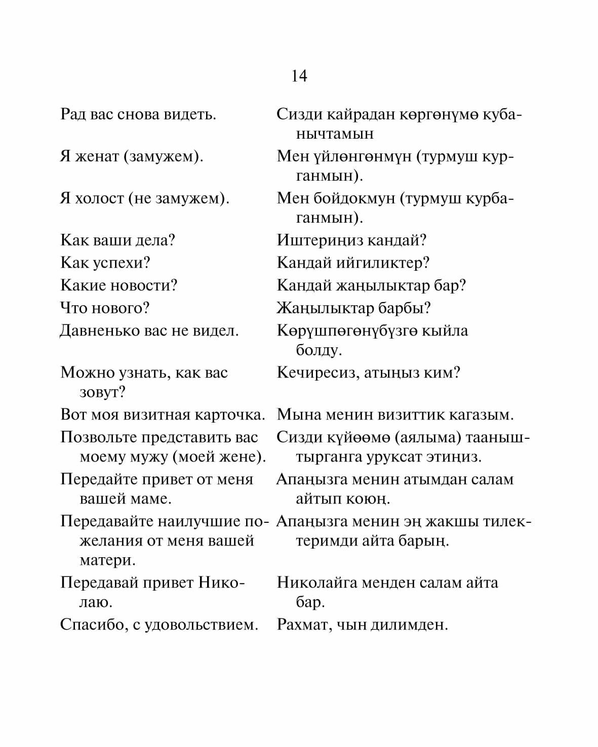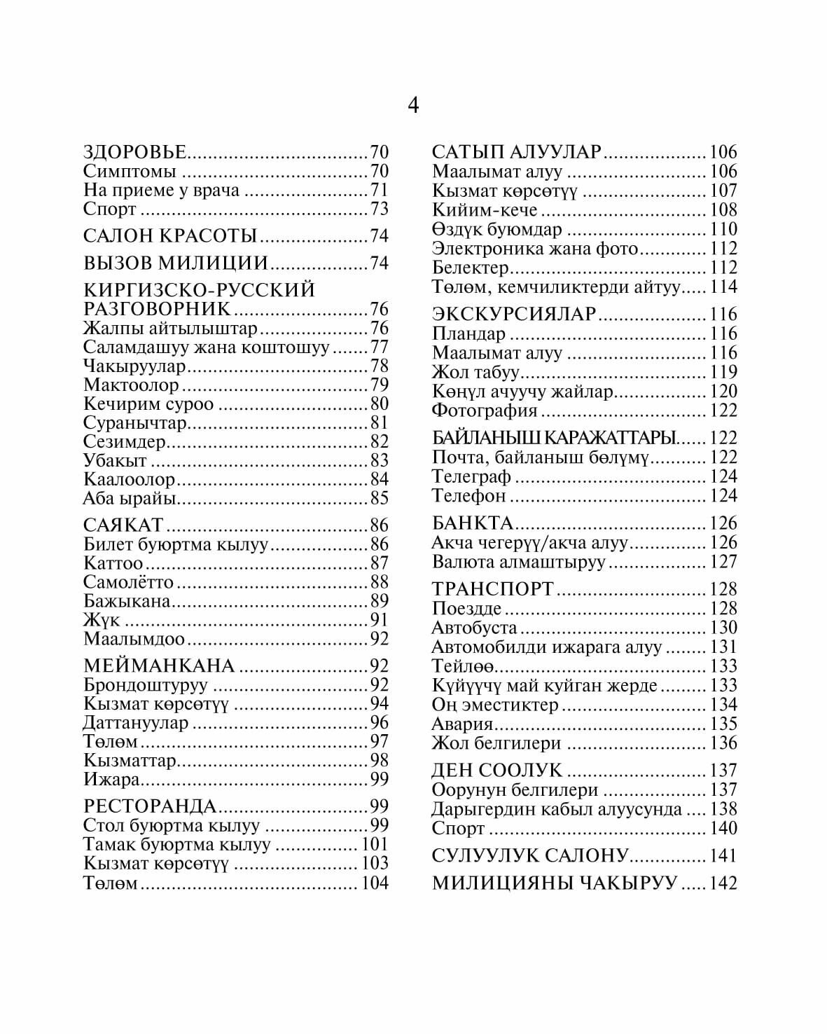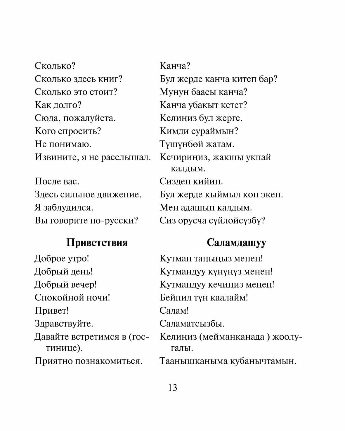Разговорник включает в себя наиболее распространенные и употребляемые фразы, обороты речи и тематику, необходимые для полноценного общения между собеседниками. Все необходимые для бытового общения выражения будут у вас под рукой, и на русском, и на киргизском языке. Чтобы максимально упростить задачу, к каждому переведенному слову дается его транскрипция русскими буквами.