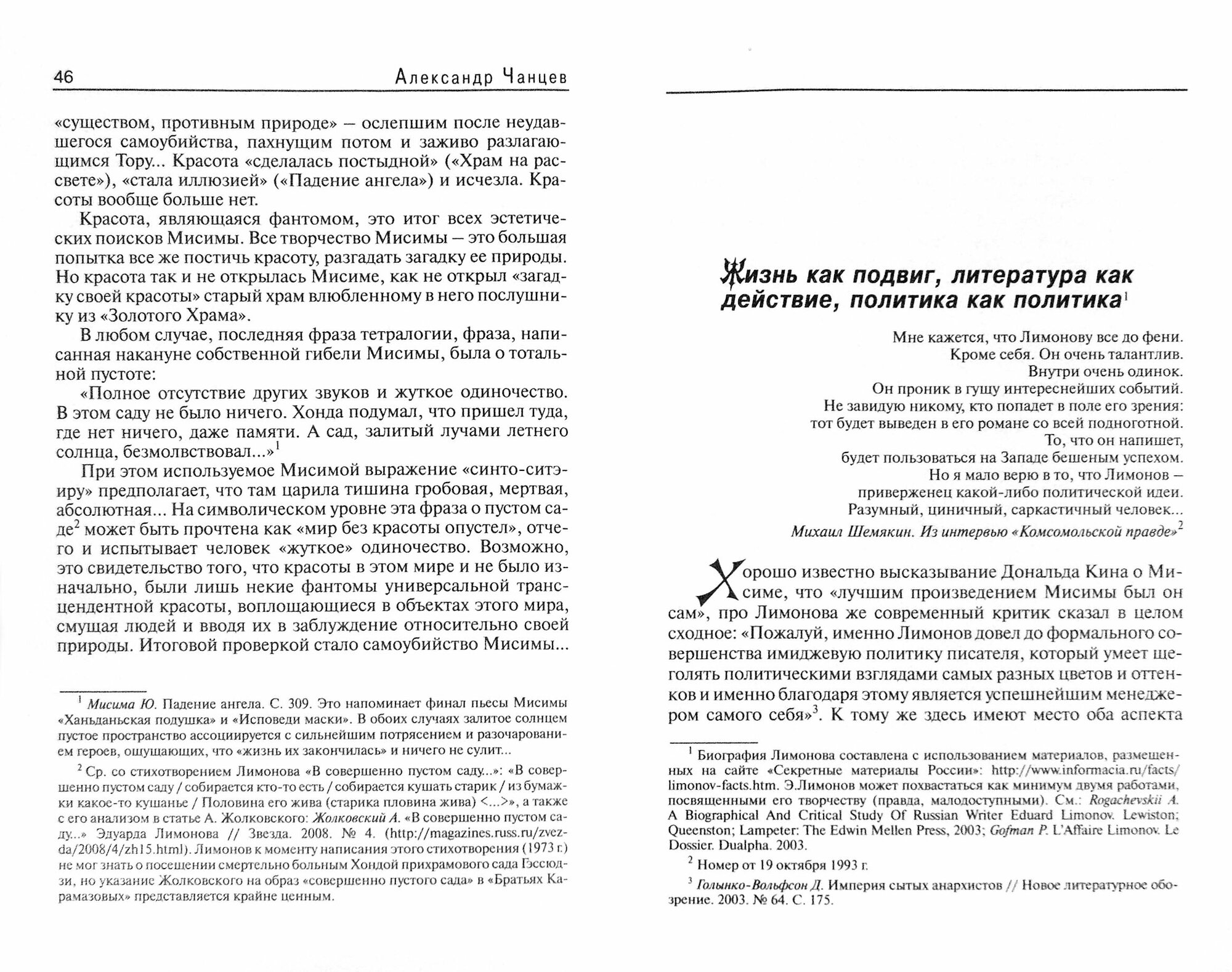 Тема этой книги - восприятие эстетики Юкио Мисимы в России, реализация идей Мисимы в творчестве Эдуарда Лимонова и некоторых его последователей. Говоря о творческом сходстве двух писателей, автор выделяет такие важные и общие элементы в их прозе, как эстетика молодости, прекрасного тела, тема героя, войны, революционного восстания. В биографиях Мисимы и Лимонова отмечаются как внешние переклички - увлечение западничеством в начале жизни, латентная гомосексуальность, скандальный имидж "неудобного писателя" в родной стране, популярность за границей, увлечение национализмом и попытка революционного восстания, так и внутренние - мотив жизнетворчества, стремление самому творить свою биографию и творить ее прежде всего в соответствии с идеалами своей эстетической системы.