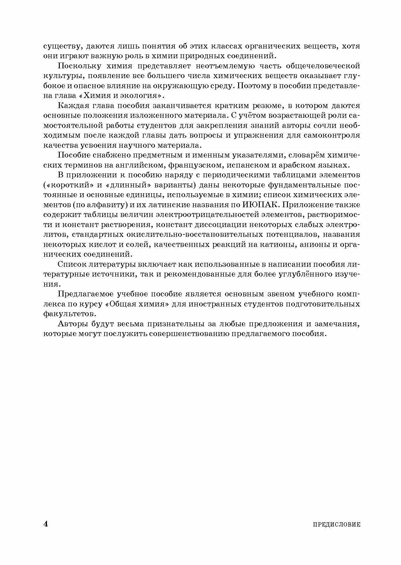 В пособии для иностранных студентов подготовительных факультетов вузов даны основные положения общей химии в современной трактовке с использованием минимального лингвистического материала. Таблицы и графики включают максимально формализованные и структурированные тексты. При написании учитывались программы по химии для иностранных студентов, занимающихся на подготовительных факультетах учебных заведений РФ. Каждая глава содержит лексико-грамматический материал, новые для студентов грамматические формы. Предлагаемое пособие является основным звеном учебного комплекса по курсу "Общая химия" для иностранных студентов подготовительных факультетов российского университета дружбы народов.