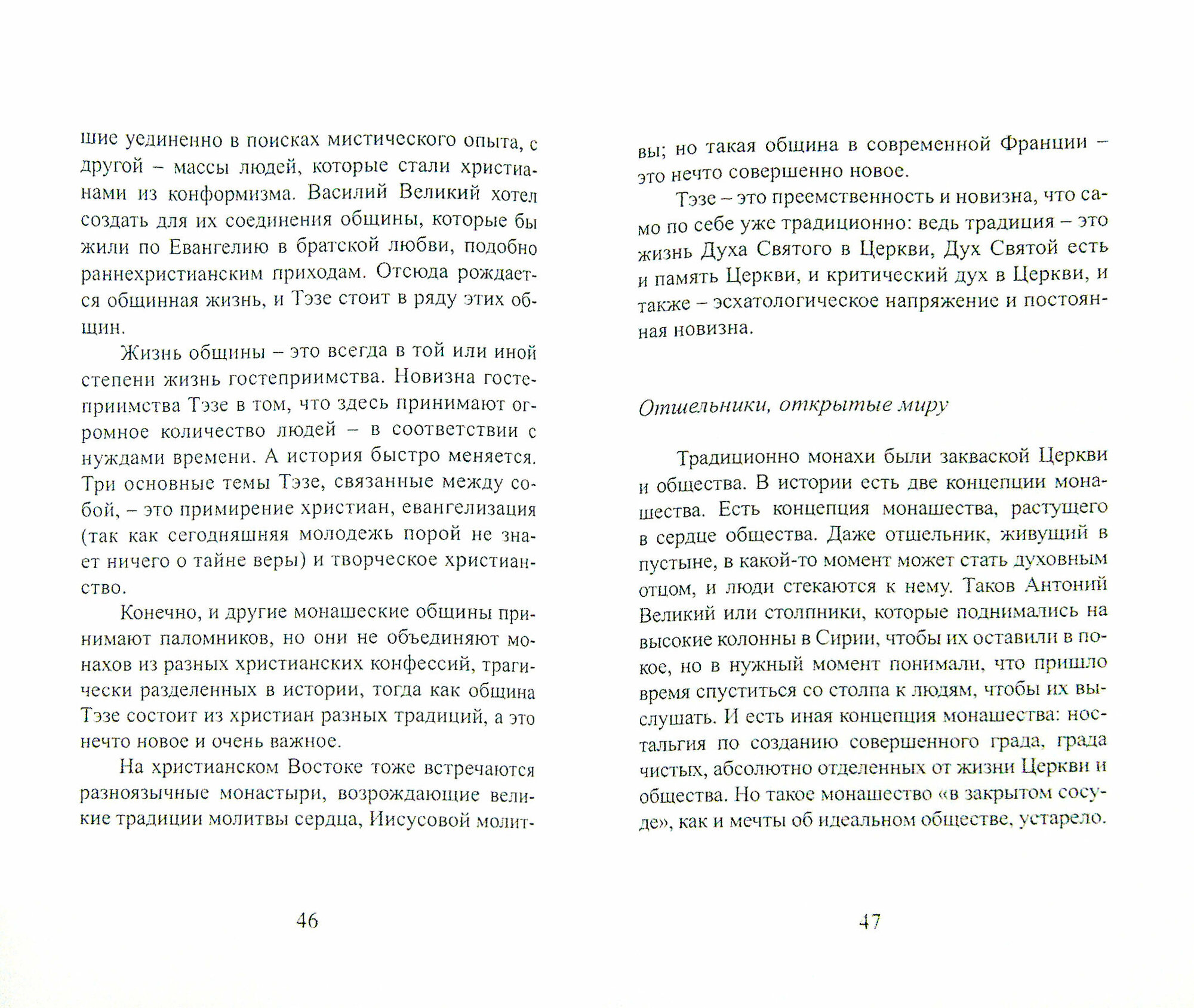В мире, наполненном пустыми обещаниями, Тэзе - земля, где предугадывается иное. Это место, где тебя принимают таким, каков ты есть, не оценивая, не судя, где не спрашивают догматический паспорт - не скрывая тем не менее, что здесь собираются вокруг Христа и что есть только одна дорога - "Я есмь путь", которая начинается здесь для того, кто этого хочет. Здесь открываешь смысл жизни и возвращаешься к себе с непреодолимым ощущением пробуждения, доверия и единства, считает известный французский богослов.