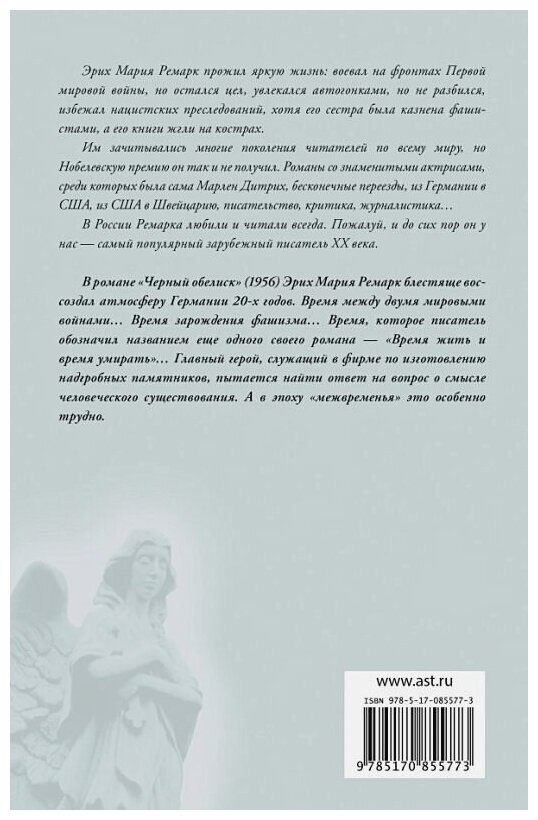 В романе "Черный обелиск" (1956) Э.М. Ремарк блестяще воссоздал атмосферу Германии 20-х годов. Время между двумя мировыми войнами… Время зарождения фашизма… Время, которое писатель обозначил названием еще одного своего романа - "Время жить и время умирать"… Главный герой, служащий в фирме по изготовлению надгробных памятников, пытается найти ответ на вопрос о смысле человеческого существования. А в эпоху "межвременья" это особенно трудно.