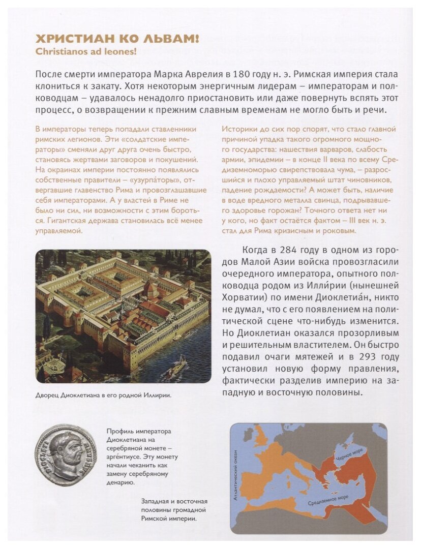 Почти 28 веков назад в центре Апеннинского полуострова возникло скромное поселение. Ему было суждено вырасти в одно из самых могущественных государств за всю историю человечества и на протяжении многих веков вершить судьбы обитаемого мира. Это государство - Древний Рим. Когда ты идёшь в школу и учишься письму и счёту, когда ходишь по улицам современного города, когда пользуешься водопроводом и даже когда употребляешь слова «компьютер» или «монета», ты пользуешься наследием древнеримской цивилизации. Эта книга расскажет тебе, как жили древние римляне, что они ели, в какие игры играли, как развлекались, что строили, что выращивали на полях и в садах, как учили, лечили, как управляли государством и принимали законы. Некоторые из римских привычек покажутся тебе совершенно такими же, как сейчас, другие - странными и удивительными. А ещё перед тобой пройдёт целая череда героев римской истории, от легендарных царей, великих ораторов и полководцев до императоров, среди которых попадались и великие правители, и великие безумцы. Древний Рим до сих пор живёт рядом с нами. Не веришь? Открой эту книжку и убедись!