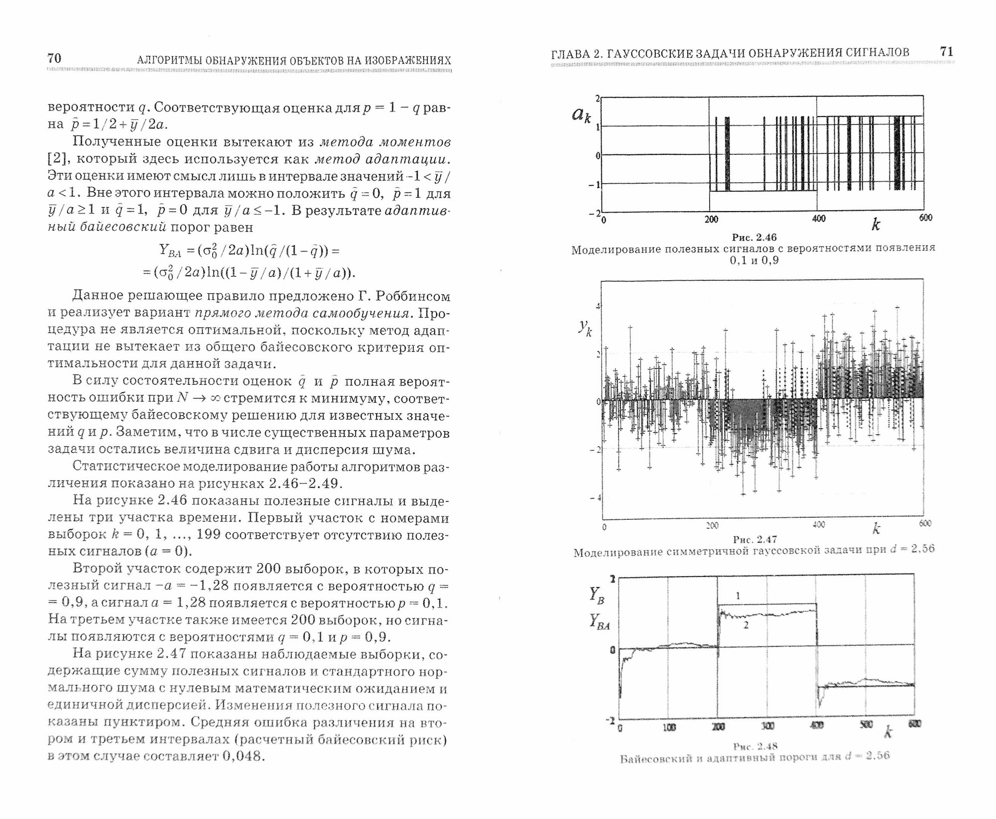 Описаны алгоритмы обнаружения и различения сигналов при действии шумов с гауссовскими и некоторыми негауссовскими распределениями. Рассмотрены простые и практические важные модельные распределения шума, дан синтез и анализ характеристик обнаружителей с адаптивным порогом при неизвестных параметрах распределения шума. Приведены программы моделирования случайных полей и программы обнаружения объектов на изображениях на фоне шумов в среде Matlab.