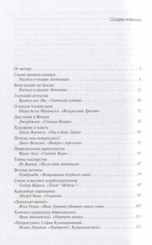 В этой книге мирно уживаются художники разных времен и направлений - в одном ряду с Веласкесом и Рембрандтом стоят Шагал и Серов, Веронезе и Зверев, безвестный автор рисунков в пещере Альтамира и Айвазовский, Вермер и Кустодиев, братья ван Эйк, Пьеро делла Франческа, Джорджоне, Халс, Левитан, Репин, Малевич, Модильяни, Матисс... Ирина Опимах избегает рассуждений об особенностях композиции, характере мазка, стилистических тонкостях и вообще обо всем том, о чем пишут искусствоведы в серьезных научных трудах. Она рассказывает прежде всего о судьбах великих творений, о художниках и временах, в которые они жили, о моделях, которые их вдохновляли. И оказывается, что у каждой картины, ставшей классикой мирового искусства, не только была, но и по сей день продолжается своя, особенная, жизнь - порой с лихо закрученным сюжетом, в котором высочайшим взлетам человеческого духа сопутствуют безумные авантюры, любовные драмы, алчность и предательство...