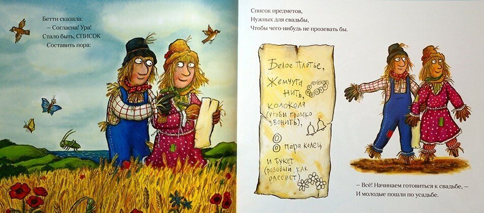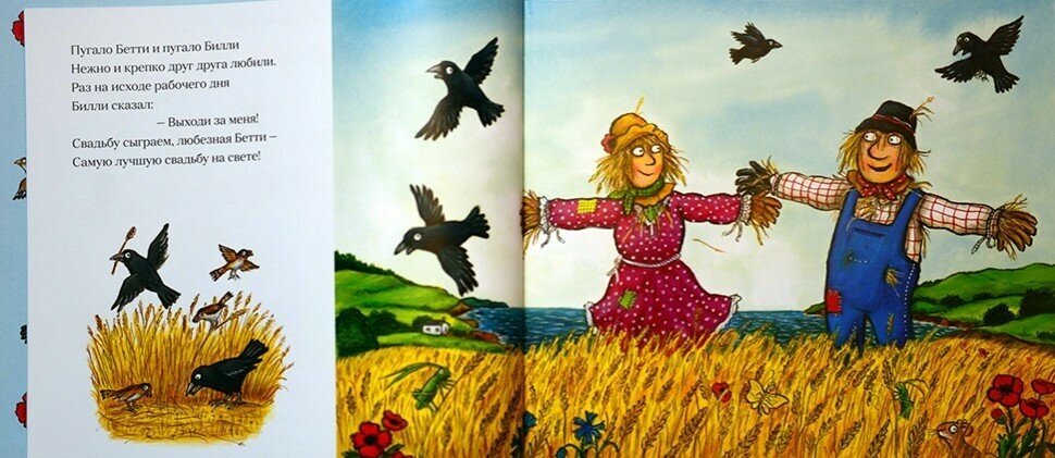 Пугало Бетти и пугало Билли / Нежно и крепко друг друга любили. / Раз на исходе рабочего дня / Билли сказал: / - Выходи за меня! …"Согласна! Ура!" - сказала Бетти, и молодые принялись за приготовления. Портной паучок сшил пышное платье из белых как снег гусиных перьев. Коровы одолжили свои колокольца - чтобы весело трезвонить на свадьбе. Краб нанизал бусы из пестрых раковин. Шустрые мышки обшарили двор - добыли кольца от стареньких штор. Осталось нарвать большущий букет, и Билли отправился за ним. Но вот прошел один день, за ним второй, а Билли все нет. Бетти в тревоге: вдруг он другую навек полюбил? А между тем, фермер выставил в поле новое пугало - Гарри. Он франт и любезник и хочет расстроить свадьбу. Джулию Дональдсон называют "детским Шекспиром сегодня", а Аксель Шеффлер - один из самых ярких и узнаваемых иллюстраторов наших дней. "Самая лучшая свадьба" - долгожданная новинка этих талантливых авторов. …И, кстати, сможете ли вы найти в книге Груффало? Для детей дошкольного возраста. Для чтения взрослыми детям.