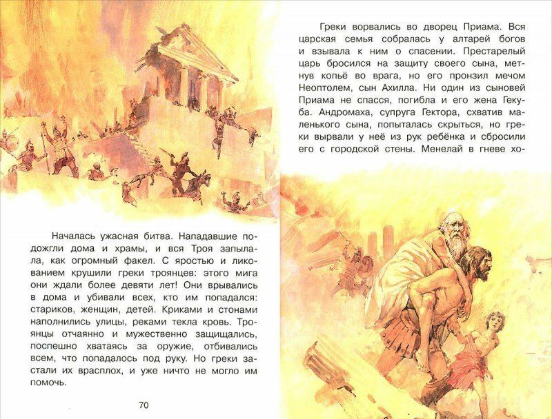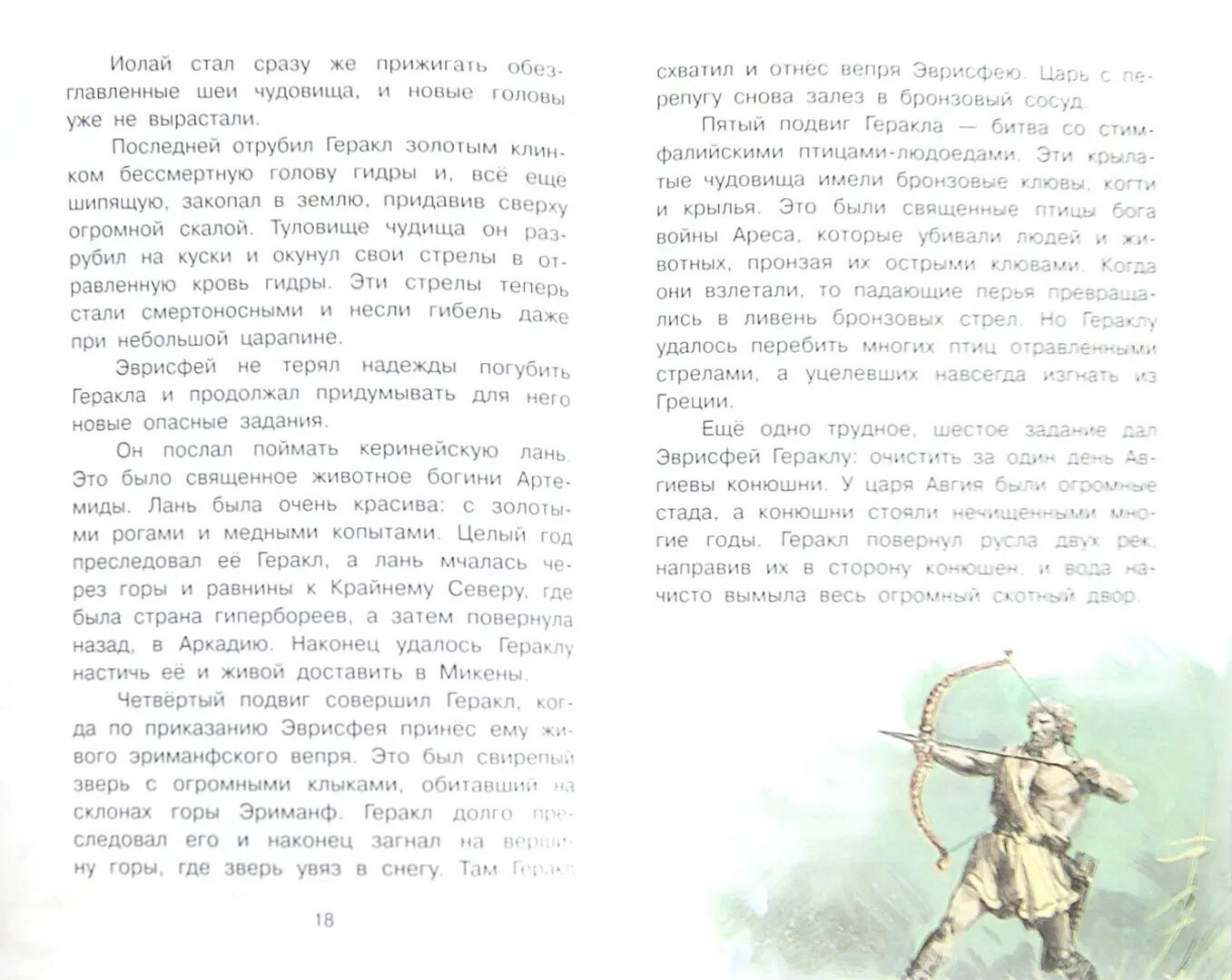 Приемлемый кратенький пересказ легенд о древнегреческих героях. Давно искала подобную книгу именно для самостоятельного чтения ребенку (7 лет). Шрифт не мелкий, но для начальной школы не стоило бояться укрупнять шрифт. Понравились эмоциональные, харАктерные иллюстрации. Есть развороты без иллюстраций. Размер книги чуть меньше стандартного. Плотная бумага. Немного пахнет краской, но не сильно. В целом, все хорошо.