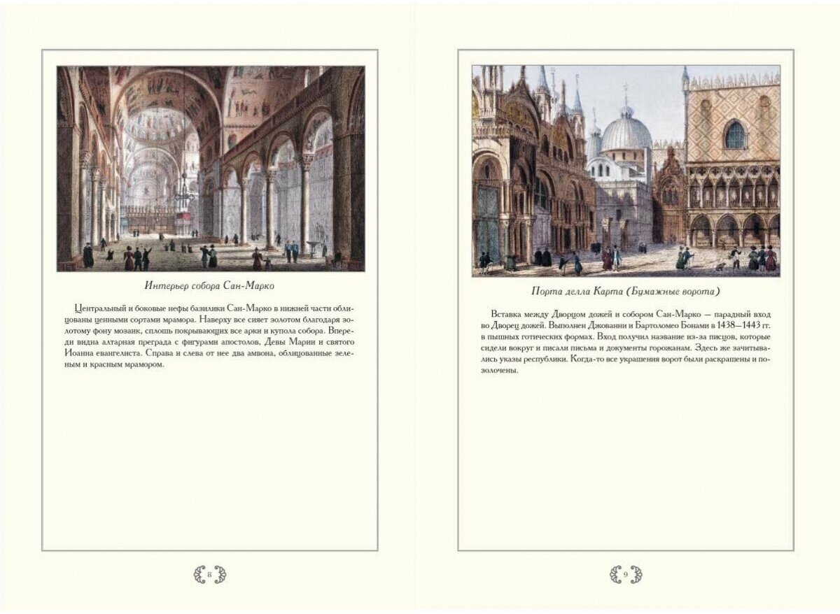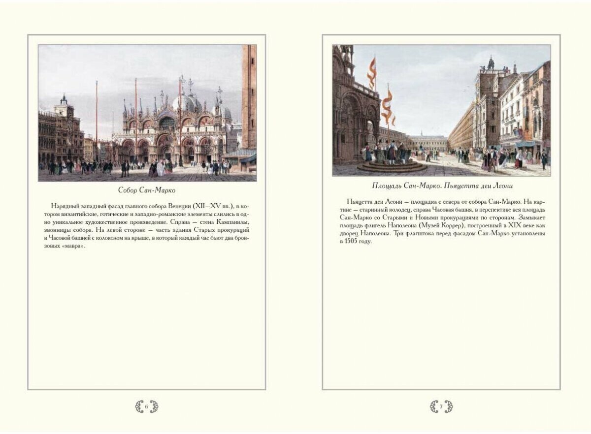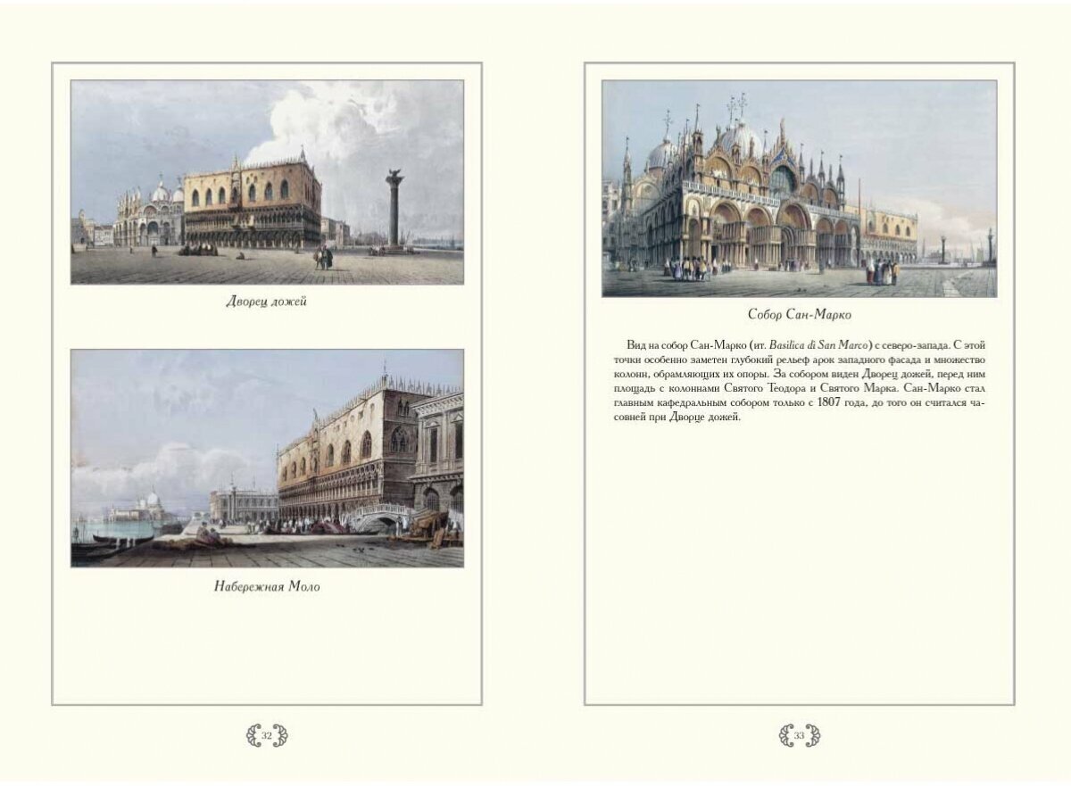 В альбоме представлены литографии и гравюры с видами Венеции и ее окрестностей, а также с изображениями различных знаковых венецианских исторических событий.