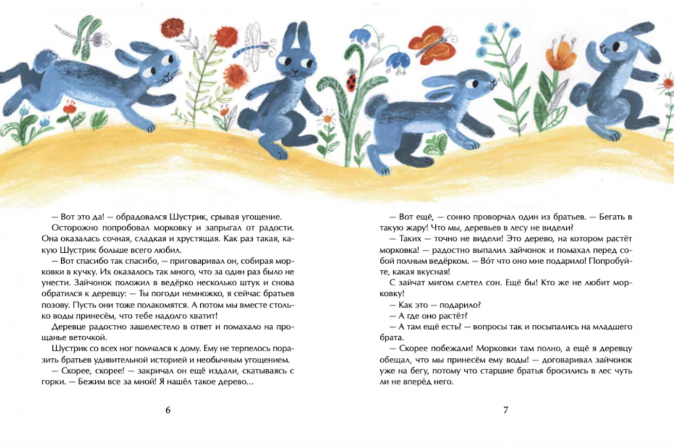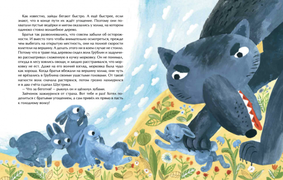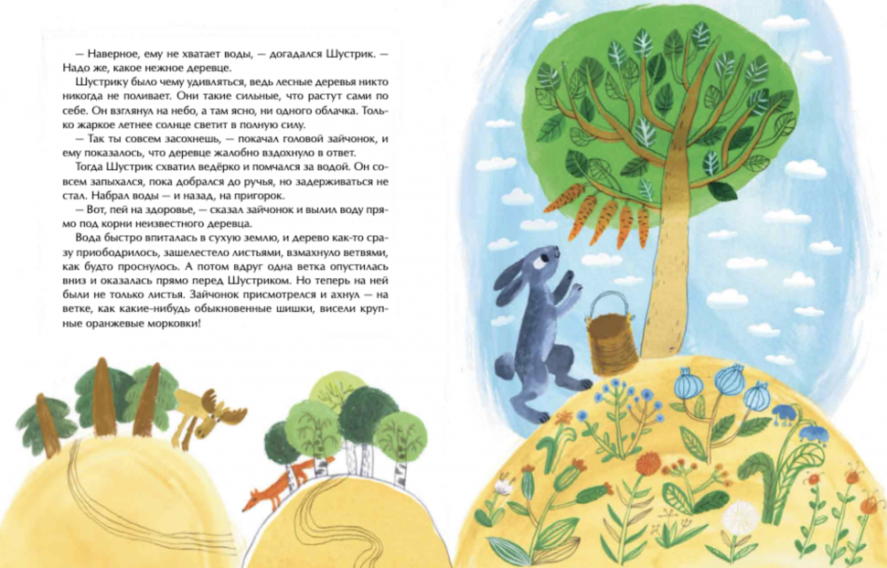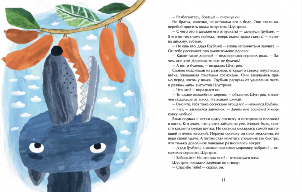 История о том, как милейший крохотный заяц Шустрик однажды спас дерево, погибающее от засухи в летний зной. А дерево оказалось волшебным и в благодарность вырастило для зайца сладкую и сочную морковку. Щедрый и добрый Шустрик решил непременно поделиться угощением со своими братьями. Но пока бегал за ними, горку морковки, неизвестно откуда взявшуюся под деревом, обнаружил волк Грублин. Прекрасное имя для вредного волка, не правда ли? :-) Чтобы спасти себя и братьев, Шустрику пришлось раскрыть волку секрет волшебного дерева. А когда оно вырастило для Грублина сосиски и палку колбасы, он мудро рассудил, что «такая корова нужна самому», и стал дерево охранять, не подпуская к нему ни зверей, ни птиц, даже не разрешая его поливать. И за ночь дерево погибло от жажды.