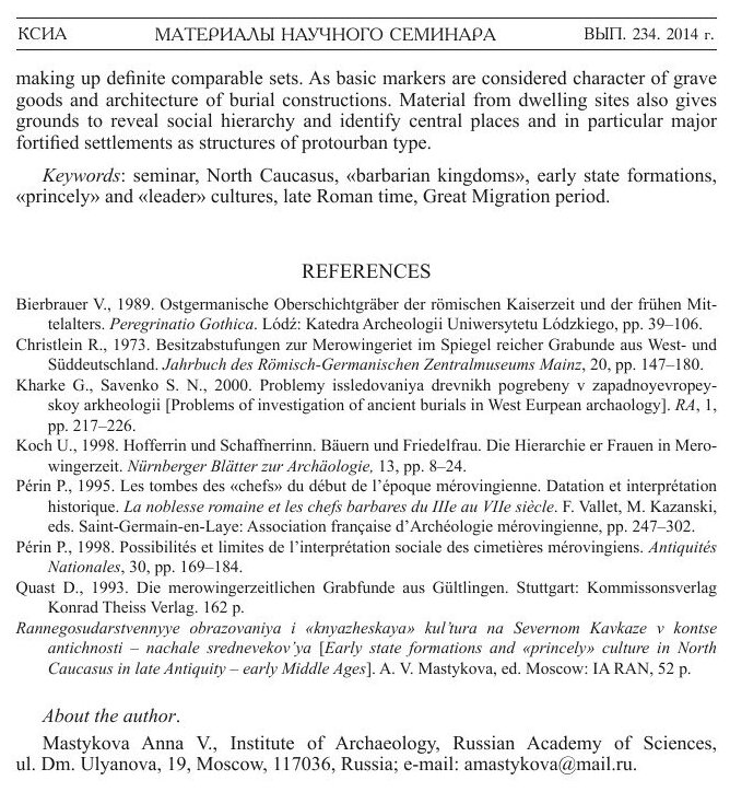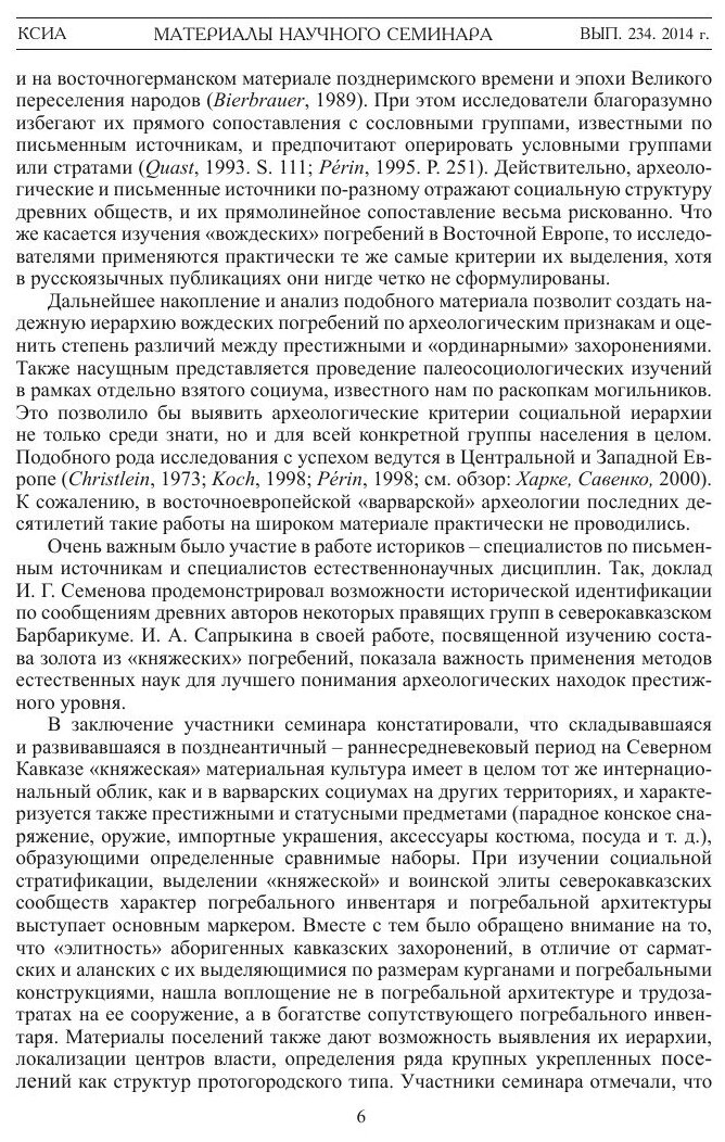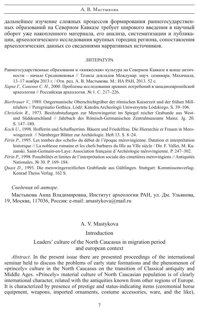 В настоящем сборнике публикуются материалы международного семинара "Вождеская культура Северного Кавказа эпохи Великого переселения народов и общеевропейский контекст", проходившего в Махачкале в ноябре 2013 г. В статьях обсуждаются проблемы формирования элитной воинской материальной культуры, публикуются яркие материалы из погребений воинских предводителей и дружинного сословия. Интернациональный характер престижных находок свидетельствует о сходных процессах сложения раннегосударственных образований и появления новых центров власти, проходивших в конце античности и в начале Средневековья на широкой территории от Западной Европы до южнорусских степей, Крыма и Северного Кавказа. Второй блок статей посвящен результатам биоархеологических исследований материалов различного времени - от мезолита и неолита до Средневековья. Особый интерес представляет применение естественнонаучных методов для реконструкции моделей взаимодействия древнего человека с окружающей средой. Выпуск привлечет внимание археологов и представителей смежных дисциплин, а также всех, кто интересуется богатым историческим наследием России.
