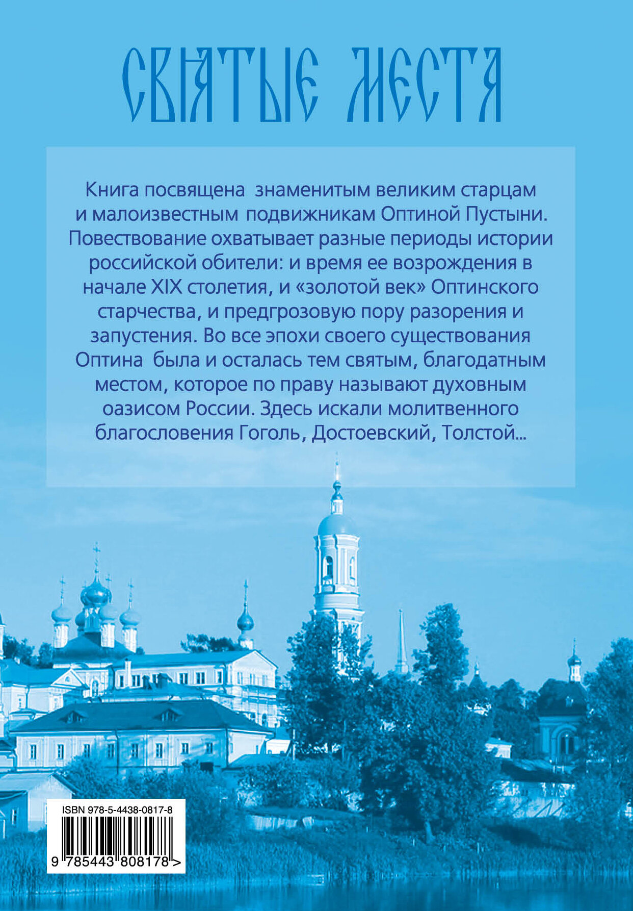 Книга посвящена знаменитым великим старцам и малоизвестным подвижникам Оптиной Пустыни. Повествование охватывает разные периоды истории российской обители: и время ее возрождения в начале XIX столетия, и "золотой век" Оптинского старчества, и предгрозовую пору разорения и запустения. Во все эпохи своего существования Оптина была и осталась тем святым, благодатным местом, которое по праву называют духовным оазисом России. Здесь искали молитвенного благословения Гоголь, Достоевский, Толстой…