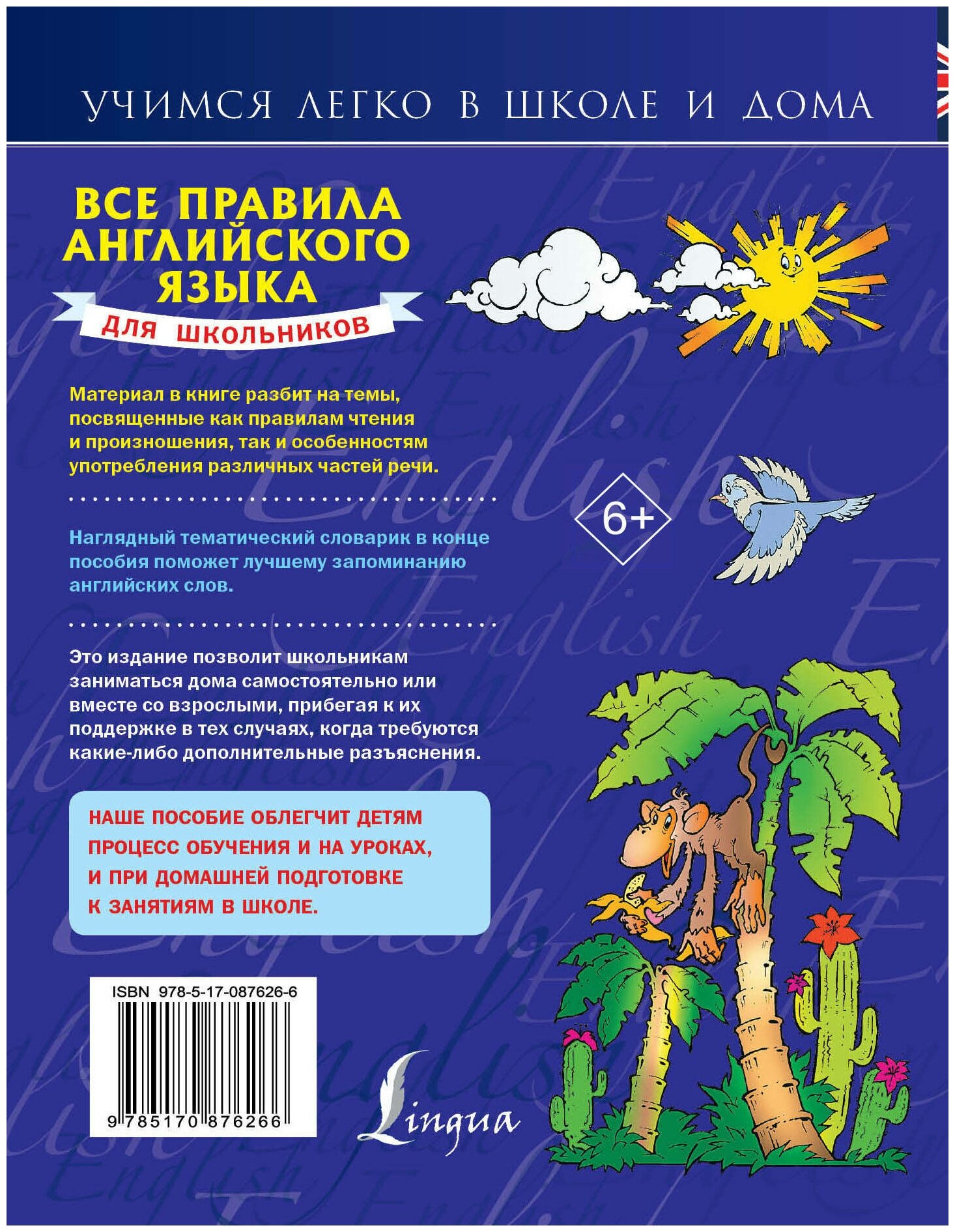 В книге содержатся правила английского языка, изучаемые преимущественно в начальной школе. Все правила сопровождаются наглядными и удобными схемами и таблицами, в конце книги расположен красочный тематический словарь. Большое количество иллюстраций привлечет внимание ребенка и поможет лучше запомнить правила и новые слова.Пособие может быть полезно учащимся школ, гимназий, лицеев, а также родителям, желающим помочь своим детям в обучении английскому языку.