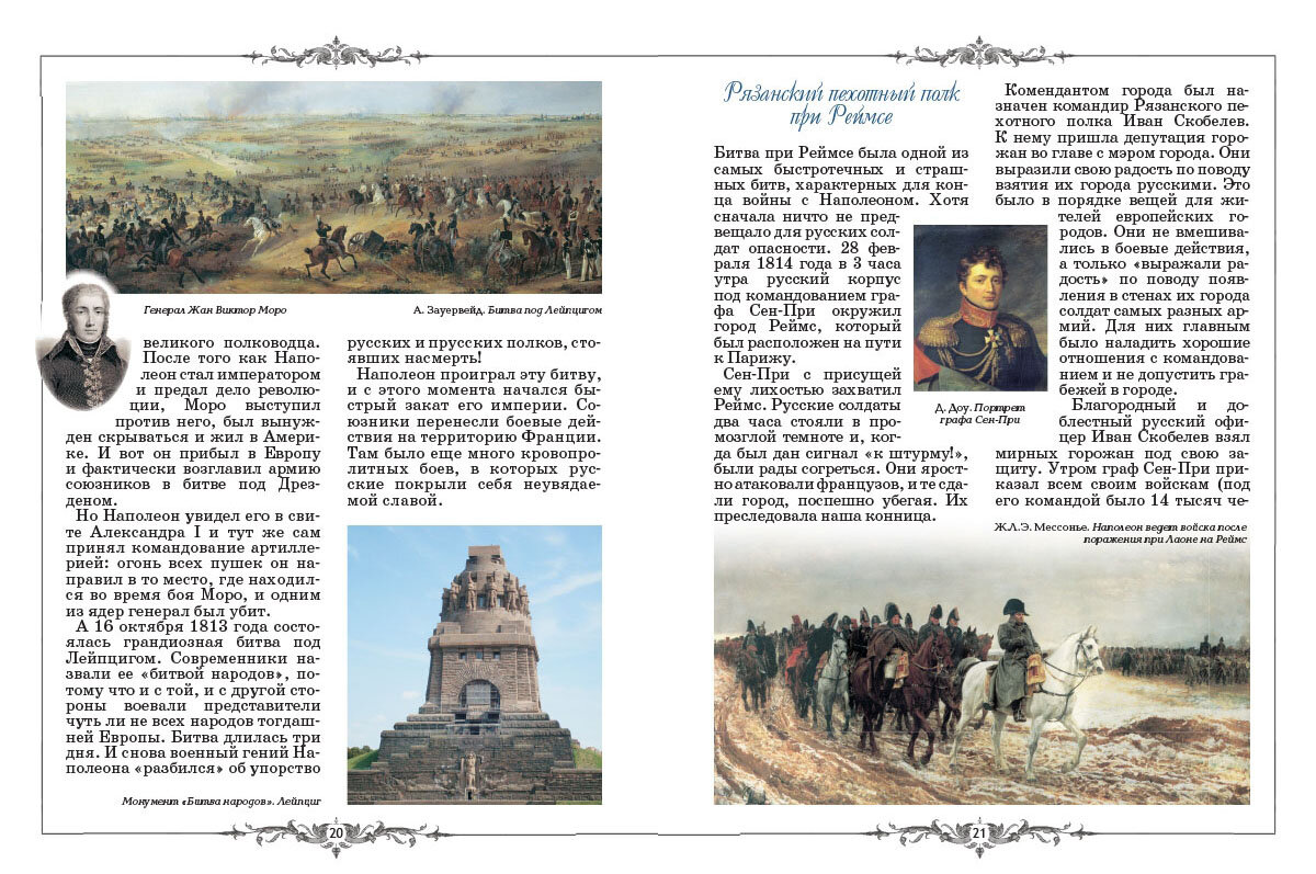 В книге описаны события с 1789 по 1814 г. Интересный материал для 48 страниц книги, радует. Читая книгу, встречаешь много исторических личностей: Кутузов, Наполеон, Скобелев, Раевский, Александр I и др.. Богатый иллюстративный материал: портреты, рисунки, картины. Патриотичная книга для семейного чтения, но особенно будет интересна мальчишкам.