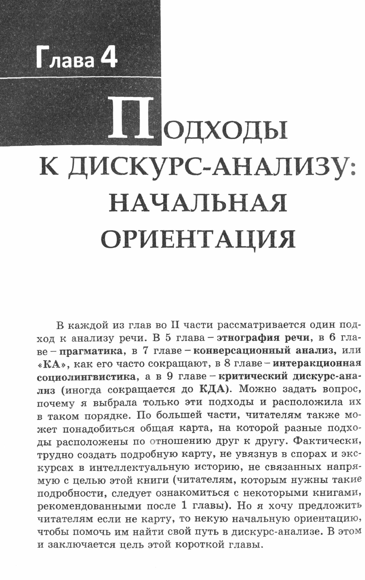 Книга содержит, помимо теоретического материала, примеры фрагментов речи с подробным пояснением методик анализа, и практические упражнения. Важный момент - ссылка на современных исследователей в рамках ключевых методов (конверсационный, прагматический анализ, КДА и т.д.) и на их классические работы.