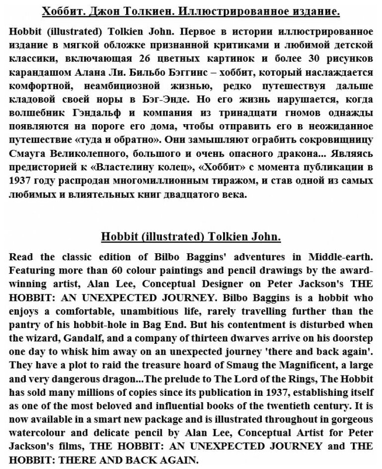 Книга потрясающая! Сюжет захватывает дух, что невозможно оторваться. Это издание с великолепными иллюстрациями позволяет целиком и полностью погрузиться в мир хоббитов, и представить как ты следуешь за Бильбо в увлекательный и интересный мир Джона Р.Р.Толкина.
