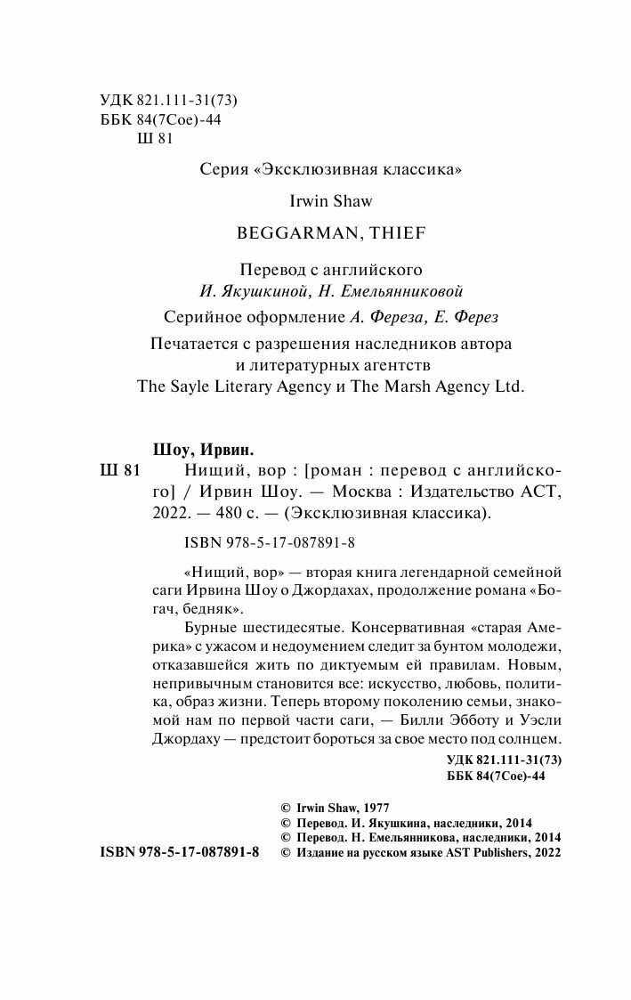 Книга: Нищий вор (Ирвин Шоу); ФТМ, 1977