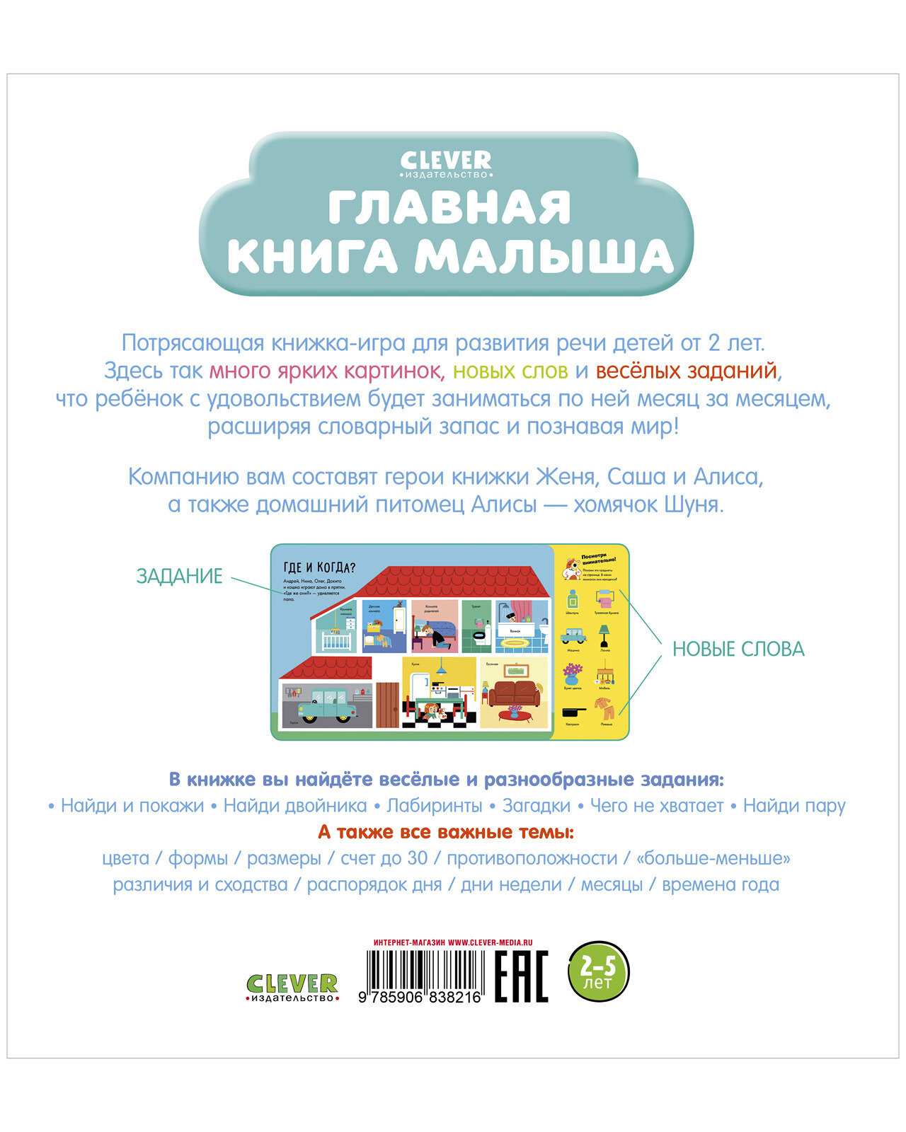 Здесь так много ярких картинок, новых слов и весёлых заданий, что ребёнок с удовольствием будет заниматься по ней месяц за месяцем, расширяя словарный запас и познавая мир! Компанию вам составят герои книжки Женя, Саша и Алиса, а также домашний питомец Алисы - хомячок Шуня.