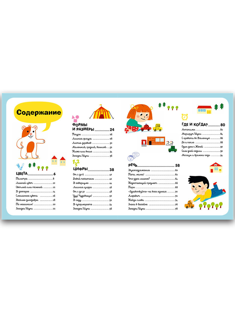 А также Вы разберете такие важные темы как: цвета, формы и размеры, счет до 30, противоположности, понятия «больше-меньше», различия и сходства, а также распорядок дня, дни недели и месяцы, времена года.