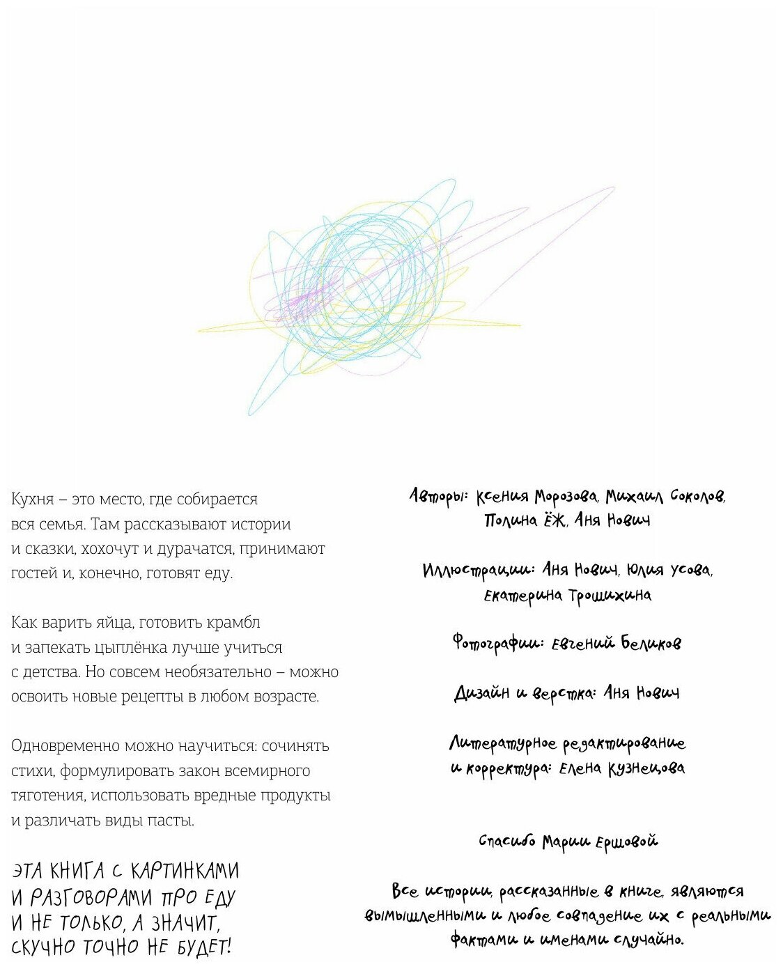 Кулинарная книга для детей, которые стали взрослыми. Для детей, у которых есть взрослые. Для взрослых, у которых есть дети. Чтобы все они вместе готовили. Первая рисованная кулинарная книга с понятными пошаговыми иллюстрациями для взрослых и детей, которые превращают готовку в игру. Как приготовить тако из чего угодно, как сделать вулкан из ментоса и кока-колы, как устроить пикник и испечь огромный торт - это книга о том, как сделать жизнь праздником.