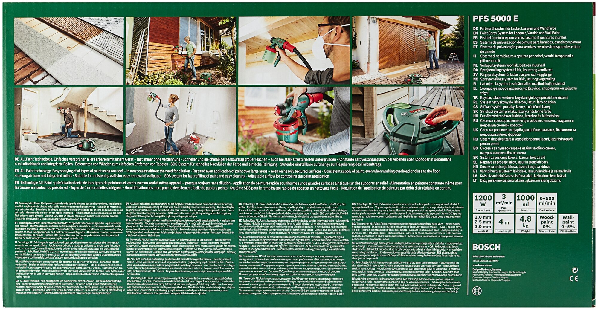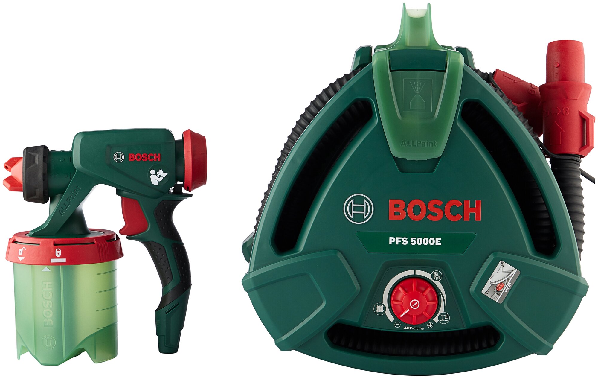 BOSCH PFS 5000 E – самая мощная и универсальная модель BOSCH в своём классе. Благодаря компрессору на 1200 Вт, инструмент распыляет все ЛКМ без разбавления: водные лазури по дереву, грунтовки, лаки и водоэмульсионные краски.