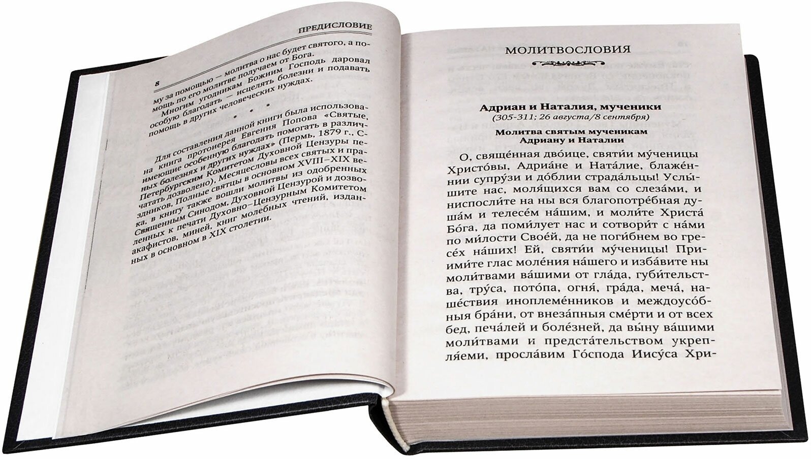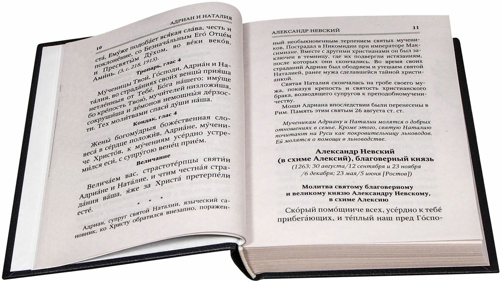Небольшого формата толстенький сборник, очень уютный, на белом офсете, шрифт достаточно крупный! Содержание реально не имеет аналогов - работа составителей проведена колоссальная. По каждому святому угоднику после молитв идёт краткая на 1-1,5 странички справка о нём, и также - в чем особенно помогает. Эти справочные материалы набраны курсивом и чуть более мелким шрифтом.