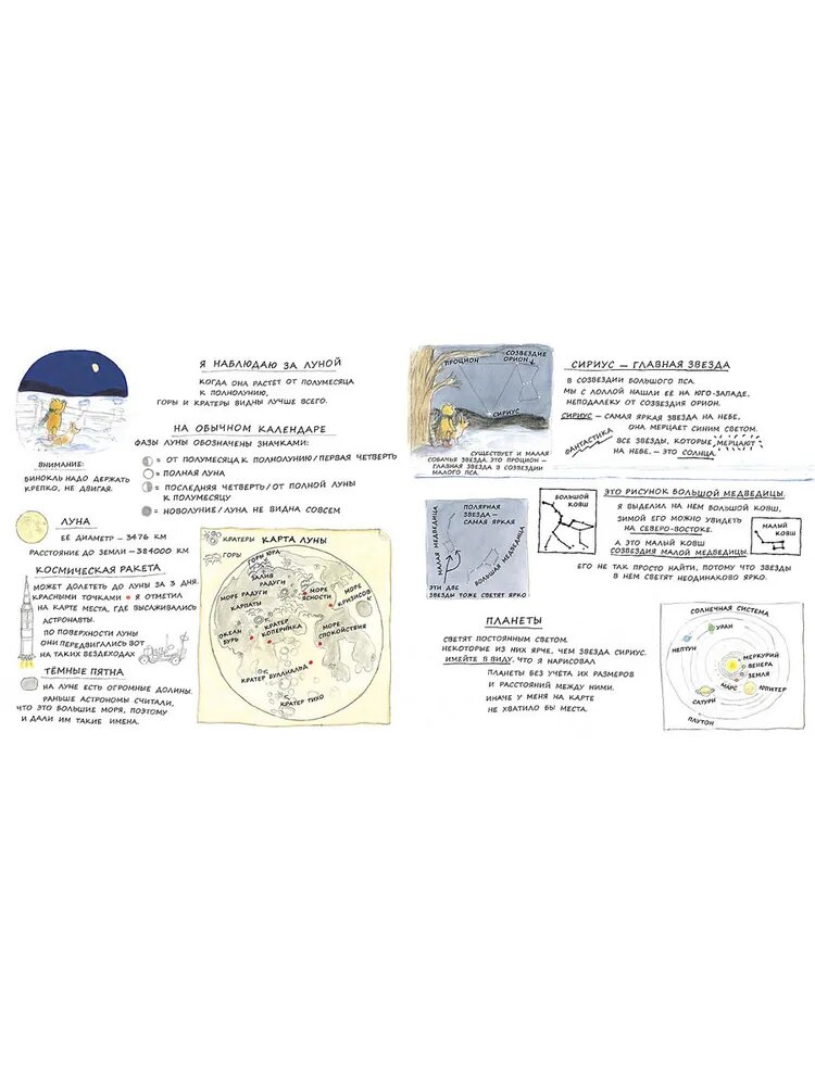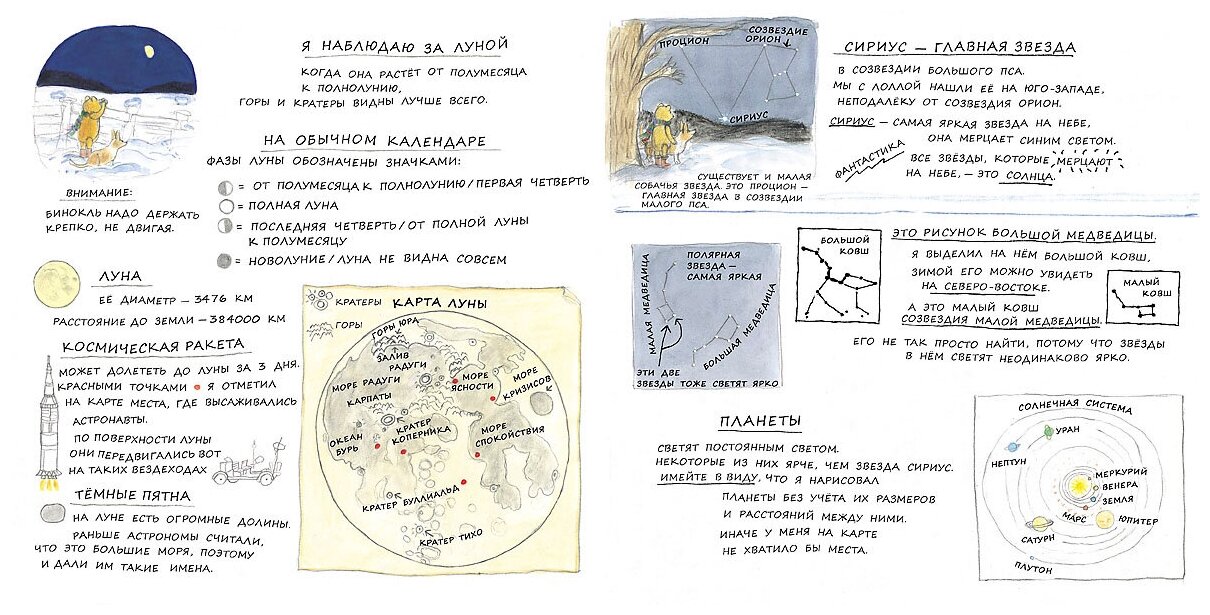 Мишка Бруно и его собака Лолла – герои 4-х книжек-картинок, созданных современной шведской художницей Гуниллой Ингвес. Каждая книга посвящена одному из времен года – зиме, весне, лету и осени – и в ней описывается один день из жизни героев, наполненный занятиями и развлечениями «по сезону». В книге «Зима мишки Бруно» мишка с собакой подкармливают семенами оставшихся на зимовье птиц, учатся различать на снегу следы животных – мыши-полевки, зайца, косули, а еще собачьи и птичьи следы. Бруно с Лоллой попадают в снежную метель, замерзают, отогреваются дома у печки, пекут оладья на обед. А вечером, когда стемнело, небо прояснилось и на нем особенно отчетливо стали видны звезды и луна, Бруно с Лоллой взяли бинокль, карту звездного неба и пошли любоваться созвездиями и луной. Главную историю книги «обрамляют» записки из дневника наблюдений Мишки Бруно, которые вынесены в начало и в конец книги. В них содержится множество зарисовок и познавательных сведений из мира окружающей природы. Первый дневниковый разворот посвящен отпечаткам на снегу следов различных животных, а второй – луне и звездам, которые особенно хорошо разглядывать именно на ясном зимнем небе. Отсюда можно узнать о том, что на Луне есть моря и горы, и что самая яркая звезда – это Сириус. А еще можно узнать, как выглядят созвездия Орион, Малая и Большая Медведицы и как устроена Солнечная система.