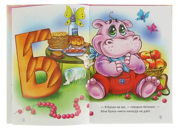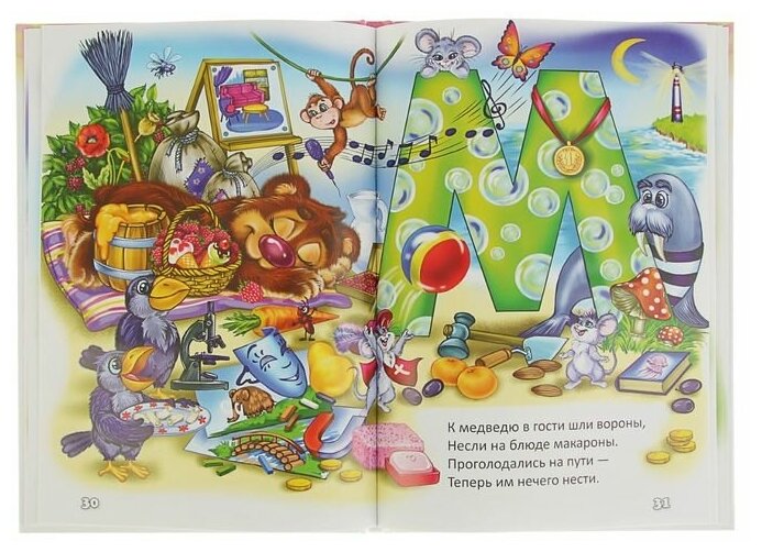 Прекрасно, что книга большого формата. Листы лощеные - не помнутся, не испачкаются. Красивые картинки. К каждой букве множество персонажей и предметов. Ребенку есть над чем поразмыслить. Например, буква К - клубника, кастрюля, клубок, колбаса, колокольчик, кофе и это еще не все названия. Ребенку можно предложить показать определенный предмет. Каждая буква расположена на развороте книги. Стихи напечатаны крупным шрифтом. Эта книга понравится не только малышам, но и более старшим детям.