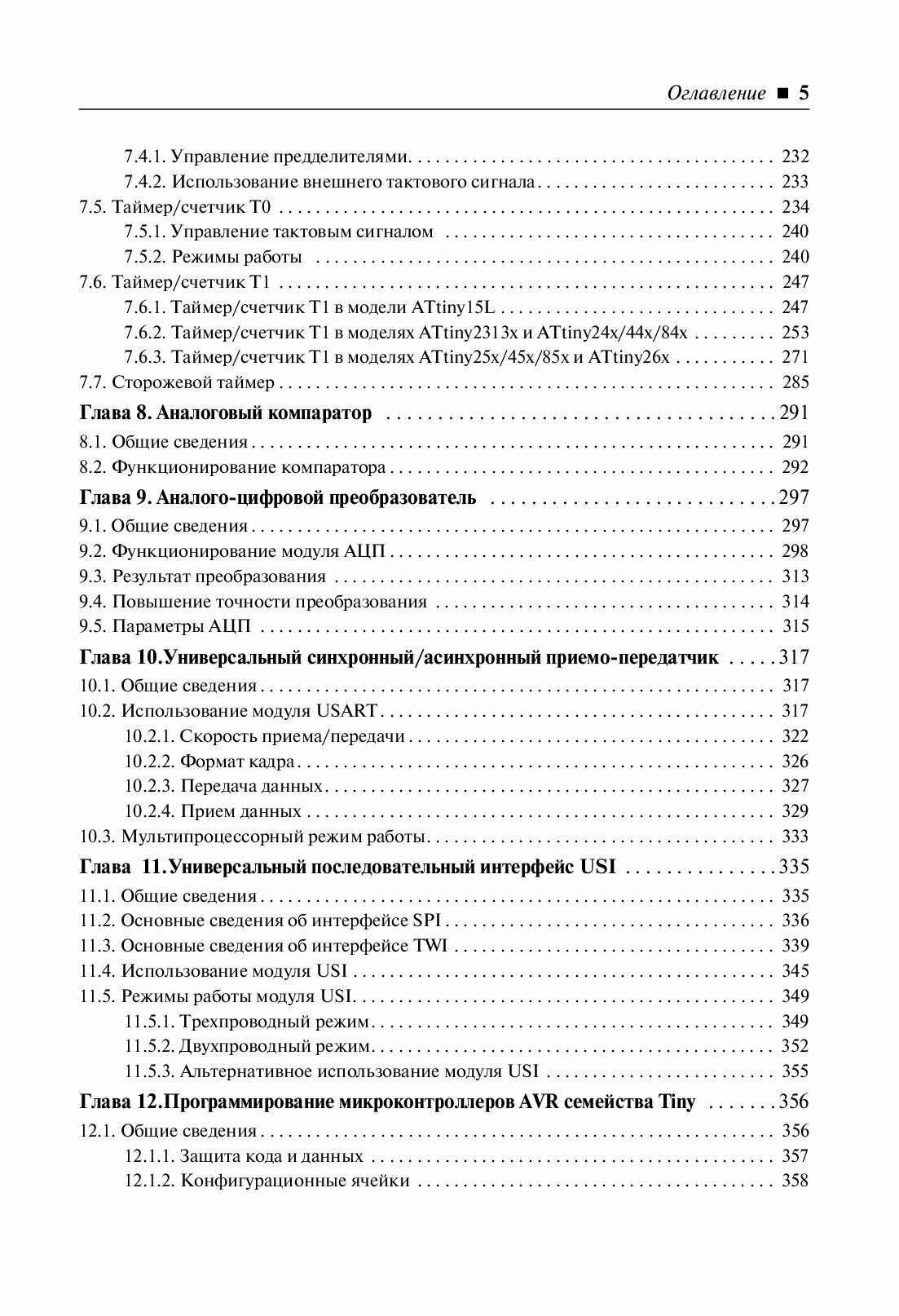 Книга посвящена однокристальным микроконтроллерам AVR семейства Tiny фирмы ATMEL. Рассмотрена архитектура микроконтроллеров AVR, ее особенности, приведены основные электрические параметры. Подробно описано внутреннее устройство микроконтроллеров, система команд, периферия, а также способы программирования. Основой данного издания послужила популярная книга "Микроконтроллеры AVR семейств Tiny и Mega", материал которой был существенно переработан и дополнен описаниями новых моделей. Предназначена для разработчиков радиоэлектронной аппаратуры, инженеров, студентов технических вузов.