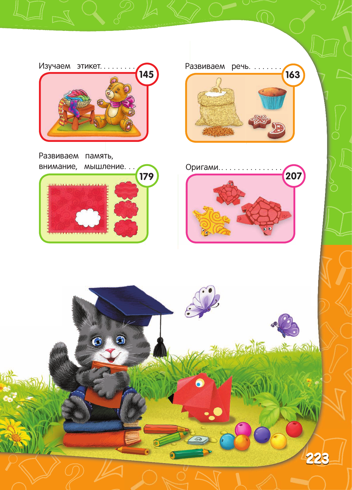 На мой взгляд это одна из лучших книг по занятиям с 4-х летним ребёнком( хотя можно и раньше этого возраста),которая состоит из 10 разделов и множества занятий. Начальные навыки чтения, счёта, развития речи преподаст малышу это пособие, а также расскажет о строении тела ( в доступной форме) , правилах поведения ( что редко встретишь в подобных книгах) и даже как сделать простые оригами ( для моторики рук просто здорово)