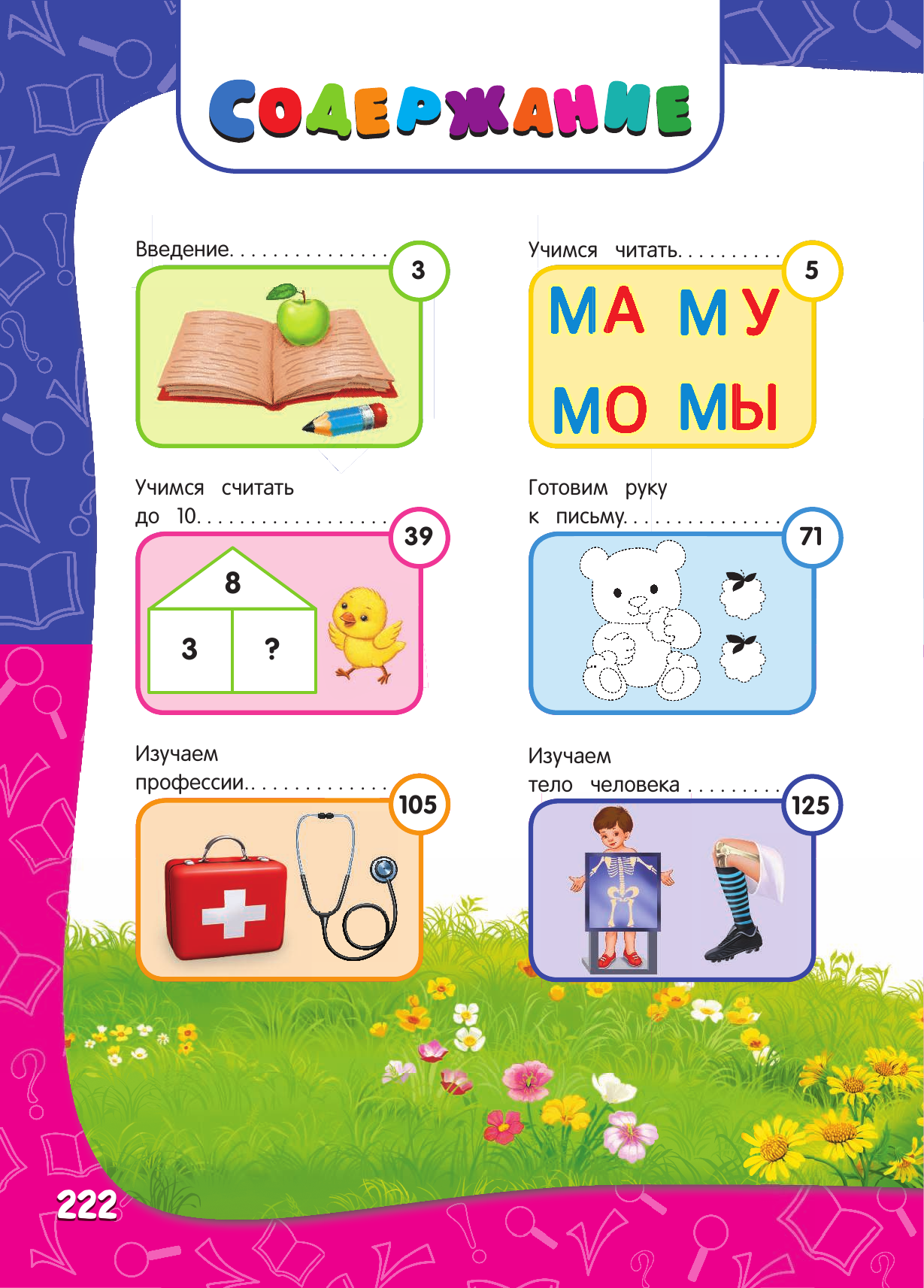 Моему сыну 3 года. У нас много развивающих книг, в том числе и на будущее. Эта одна из лучших. Понятные задания, яркие картинки. По содержанию есть самое необходимое для получения определенных навыков: чтение и счет. Содержание: