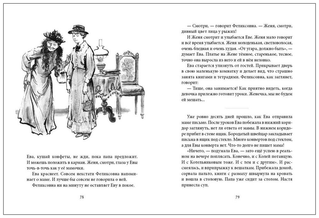 Эта повесть делает неравнодушным читателя любого возраста, заставляет остро переживать радости и беды героини - девочки Евы с непослушными рыжими волосами и живым, удивительно независимым характером. Трудно оторваться от книги, пока не перевернёшь последнюю страницу. События повести, описанные живым и ярким языком, встают перед глазами: провинциальный городок на реке Каме с его тихими улицами и заснеженными площадями, мальчики-реалисты и девочки-гимназистки, первый бал, первая любовь, подруги и недоброжелательницы, мать и мачеха, дом, "в котором никто не хочет жить"…