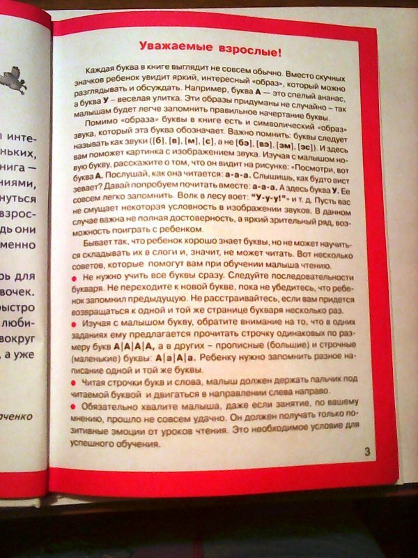 Дочке в 3.5 вдруг захотелось поизучать буквы. Я не сторонник раннего развития, но если ребенку нравится... Долго выбирала, какой букварь купить. Этот оказался интересным. Не большой, можно взять с собой. Буквы предлагаются не в азбучном порядке, а так как удобно потом слога складывать и читать. На каждую букву отдельный разворот.