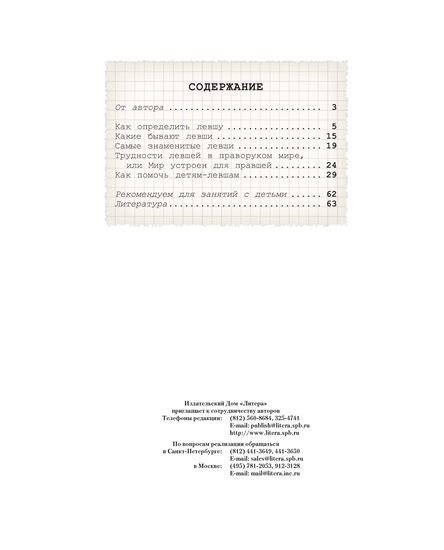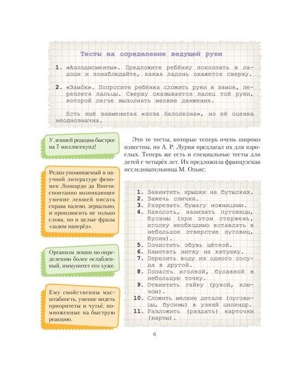 Книга совершенно не понравилась! Цена сильно завышена!!! Такое чувство, что автор по чуть- чуть выбрала информацию из разных источников и состряпала эту брошюру. Книгой это издание язык не поворачивается назвать: страниц мало, да и шрифт крупный, информации недостаточно. Первая половина книги содержит информацию о том, кто такие левши, как определить левшу, их особенности и трудности в жизни.Вторую половину книги занимают упражнения для детей-левшей. Жаль потраченных денег!