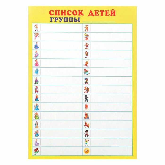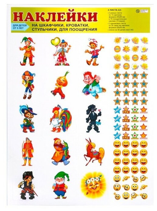 В комплект входит 4 листа наклеек для шкафчиков, кроваток, стульчиков и поощрения детей, а также бланк для составления списка детей группы.