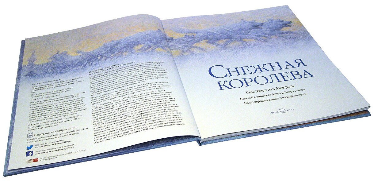 Мы взяли за основу лучший и наиболее точный, на наш взгляд, перевод "Снежной королевы" на русский язык, выполненный 120 лет назад супругами Анной и Петром Ганзен, переработали и отредактировали его, приведя в соответствие с нормами современного русского языка.